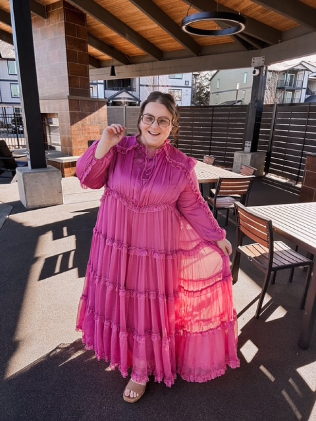 Hot pink for spring is always in! The Rosey and Radiant dress has quickly become a customer favorite this season. The modest bohemian style is perfect for weddings, Easter, Mother's Day, family photos, baby showers and more. The fit is loose, slightly oversized, and flattering. Kristen Caum styled this dress simply, letting the dress be the star of the show.