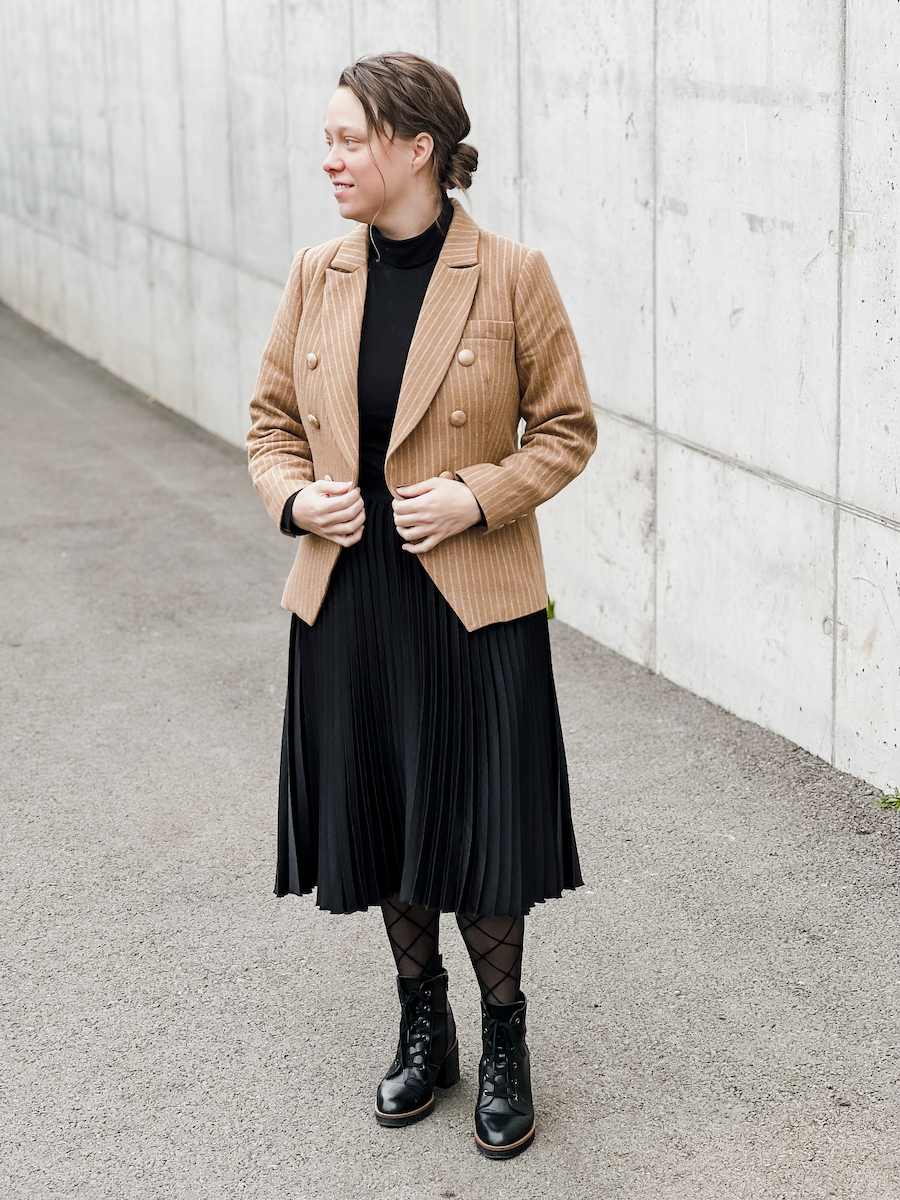 I recently got the Coffee In Central Park Blazer, and it's perfect over a black turtleneck with a pleated skirt and boots. I love the fabric and the colors of this blazer! It looks like a vintage suit, and I know it's going to last me years.
