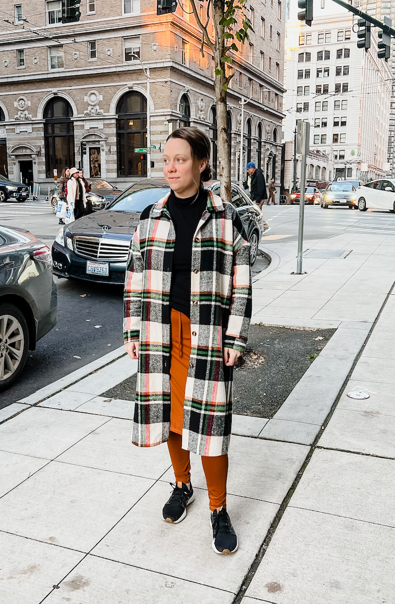 A shaket, a flannel shirt... both are super cute over a black turtleneck. I got this adorable, long, plaid shacket for my birthday last year. I wear it as much as I can! It's so cute and easy. Throw one on with your favorite athletic skirt and tennis shoes for a cozy, casual look.