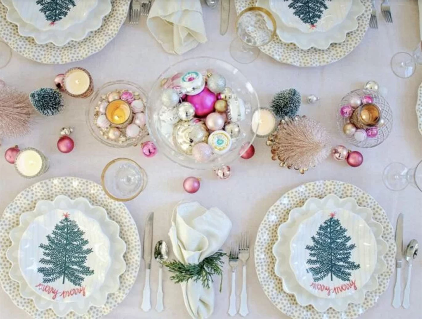 If the traditional color palette of Christmas is not your style, you don't have to sacrifice design to have a beautiful tablescape. Create the palette that suits you, adding bright pinks and teals that compliment gold or silver accents. Add a few trees and you're good to go!