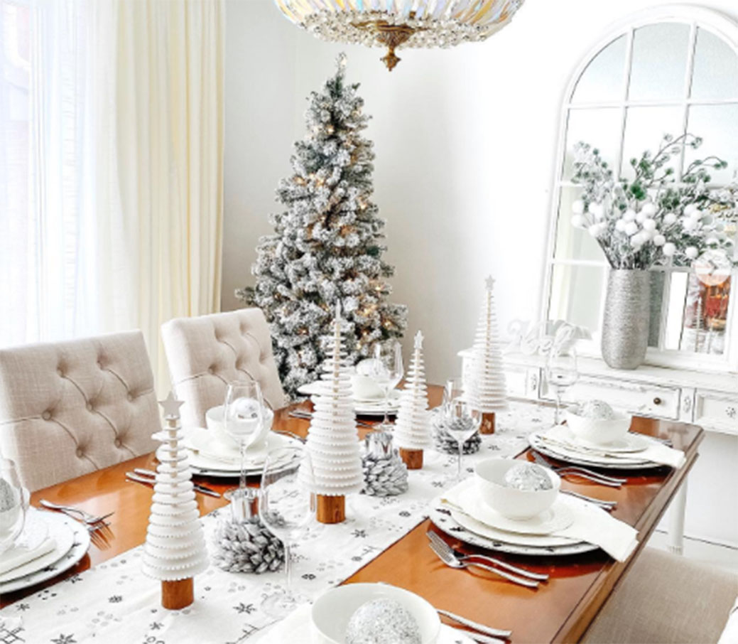 There's nothing more wonderful than a white Christmas. Bring that same feeling to your tablescape with mini white tree pieces, a delicate runner and pops of metallic silver.