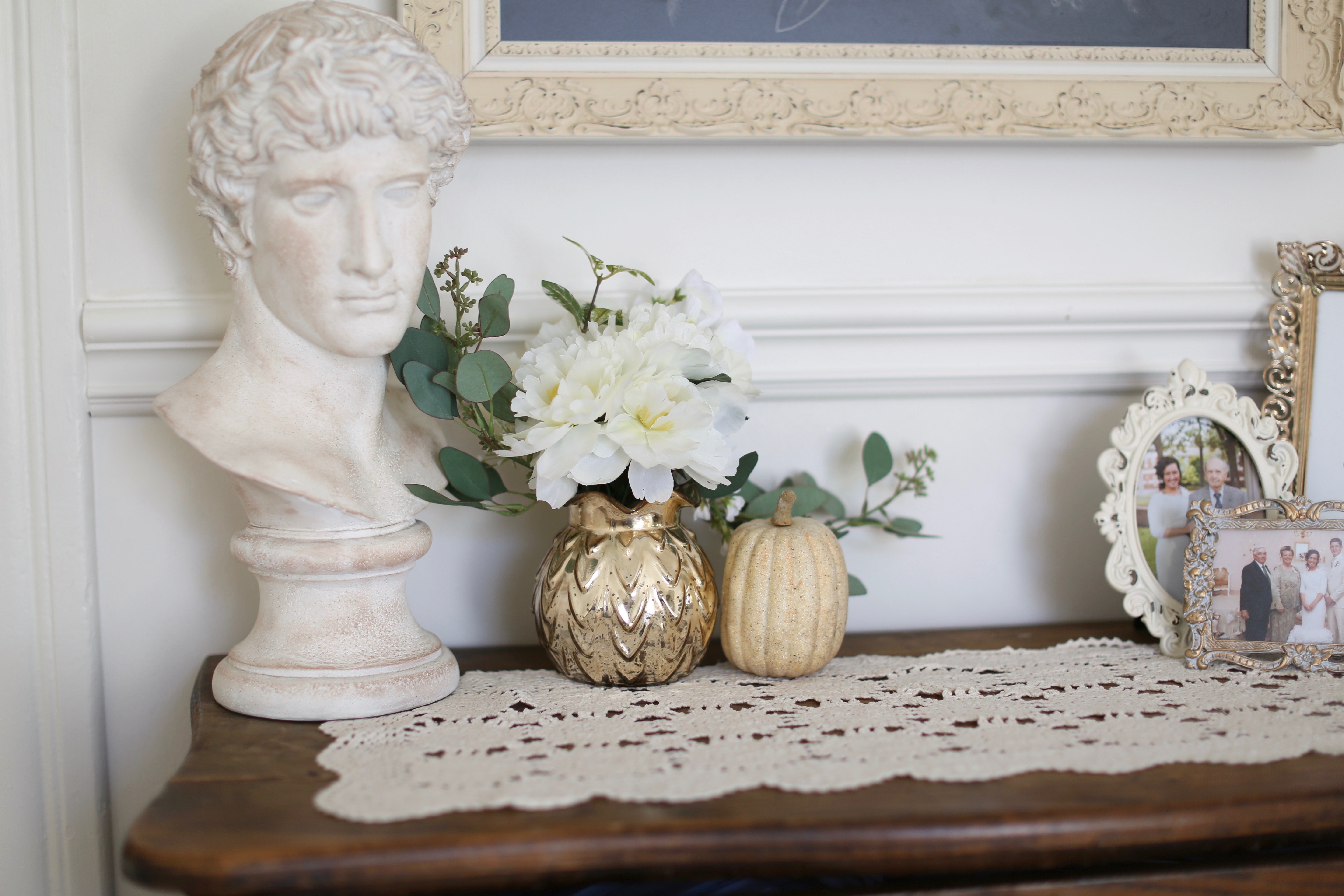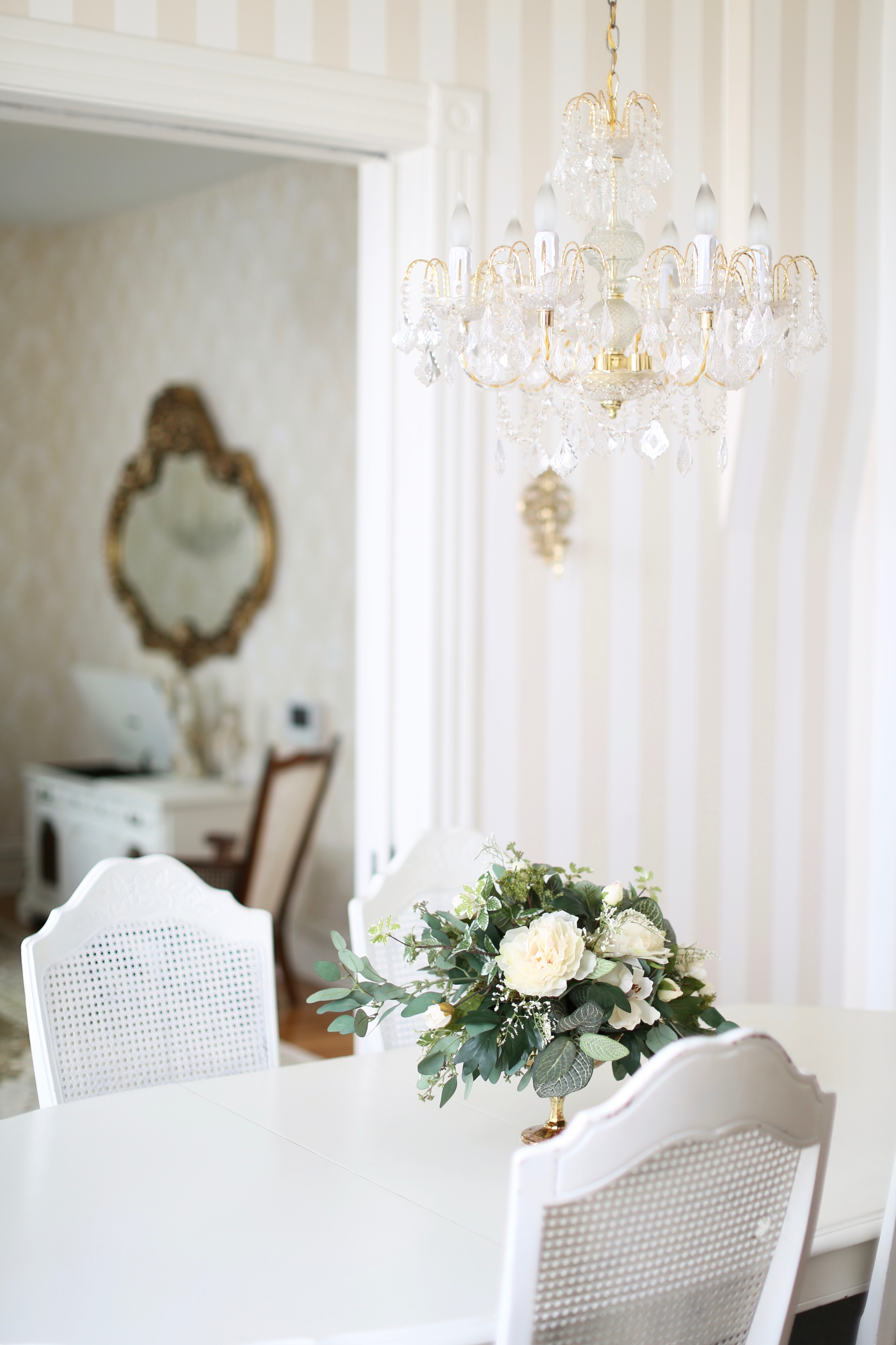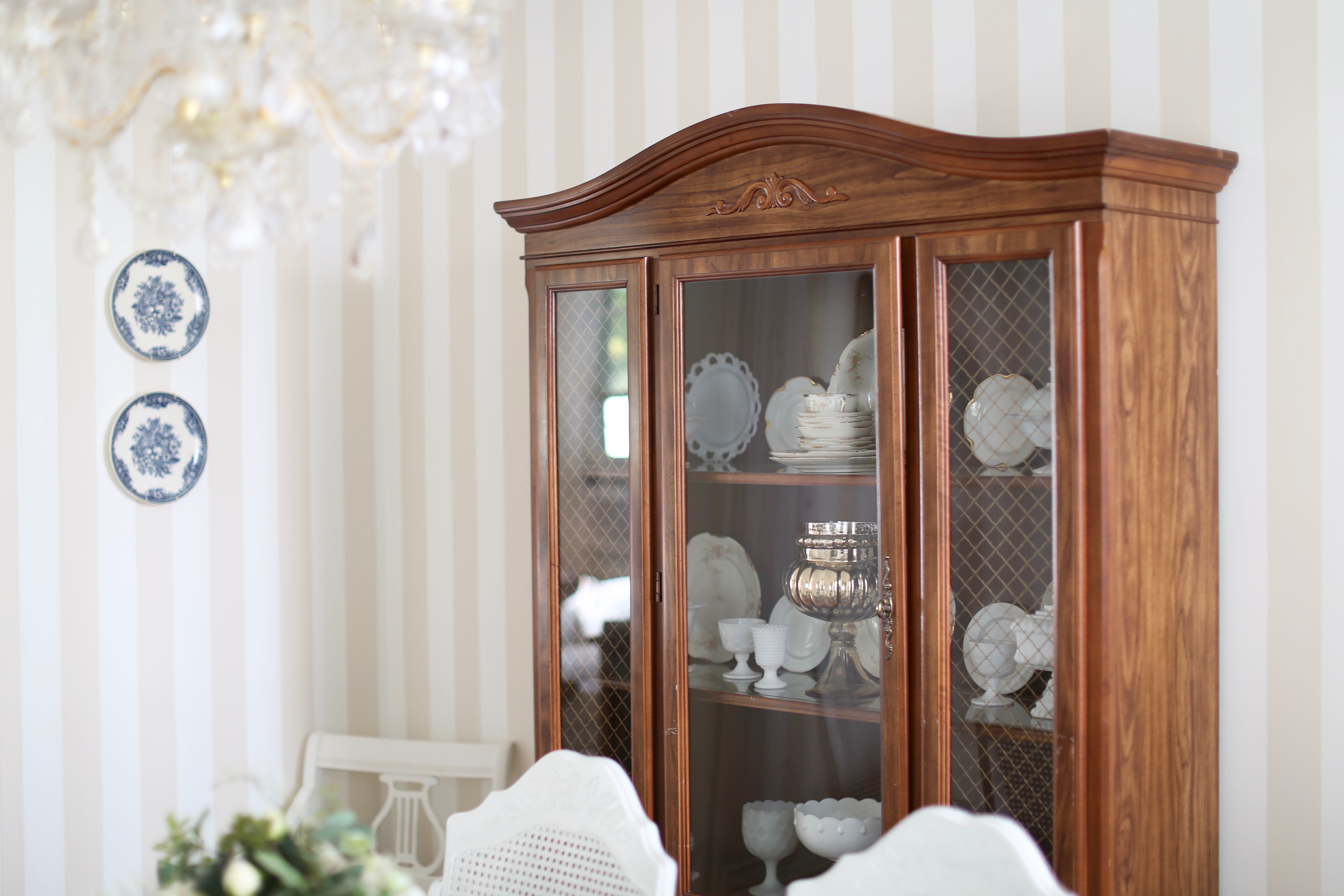 Once upon a time, my tan/white-striped chairs looked pretty horrible, but I had them painted and reupholstered. I purchased many pieces for our house from antique and estate sales and refurbished them to create a classier, more modern look. I wish I had time to go into detail about where each piece is from, but for now I’ll just say that many were very inexpensive finds! Thrifting/antiquing is one of my favorite hobbies.