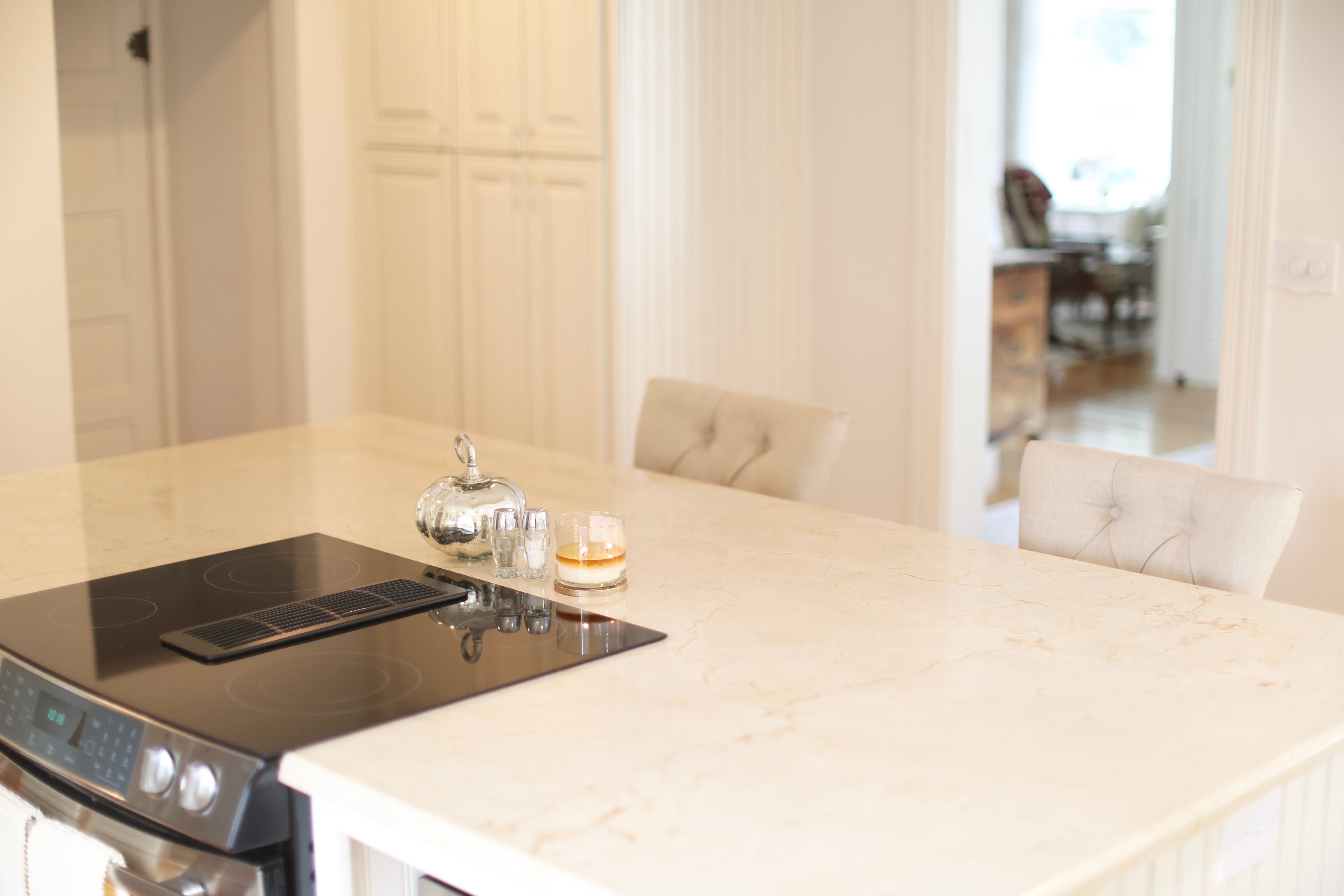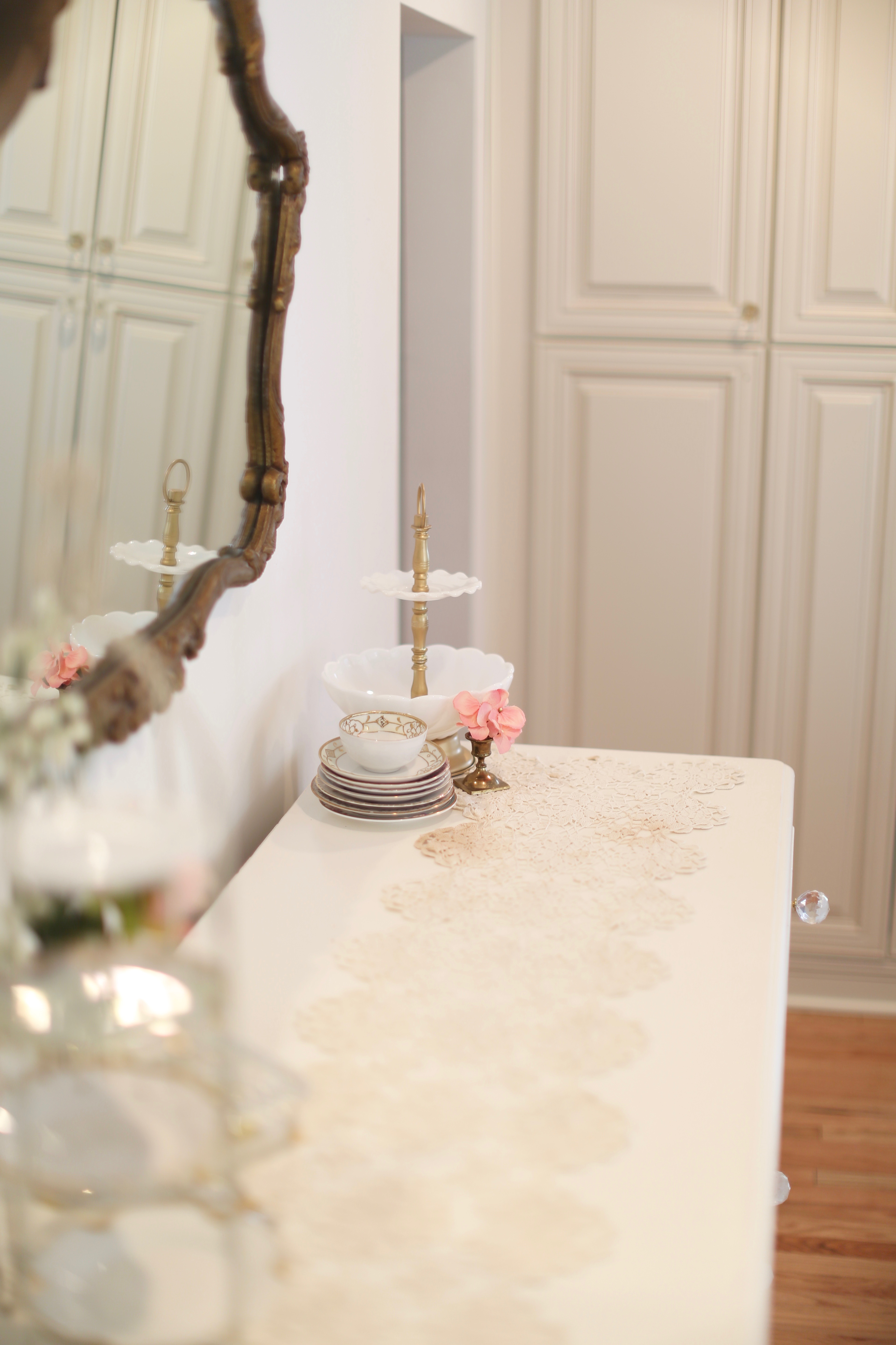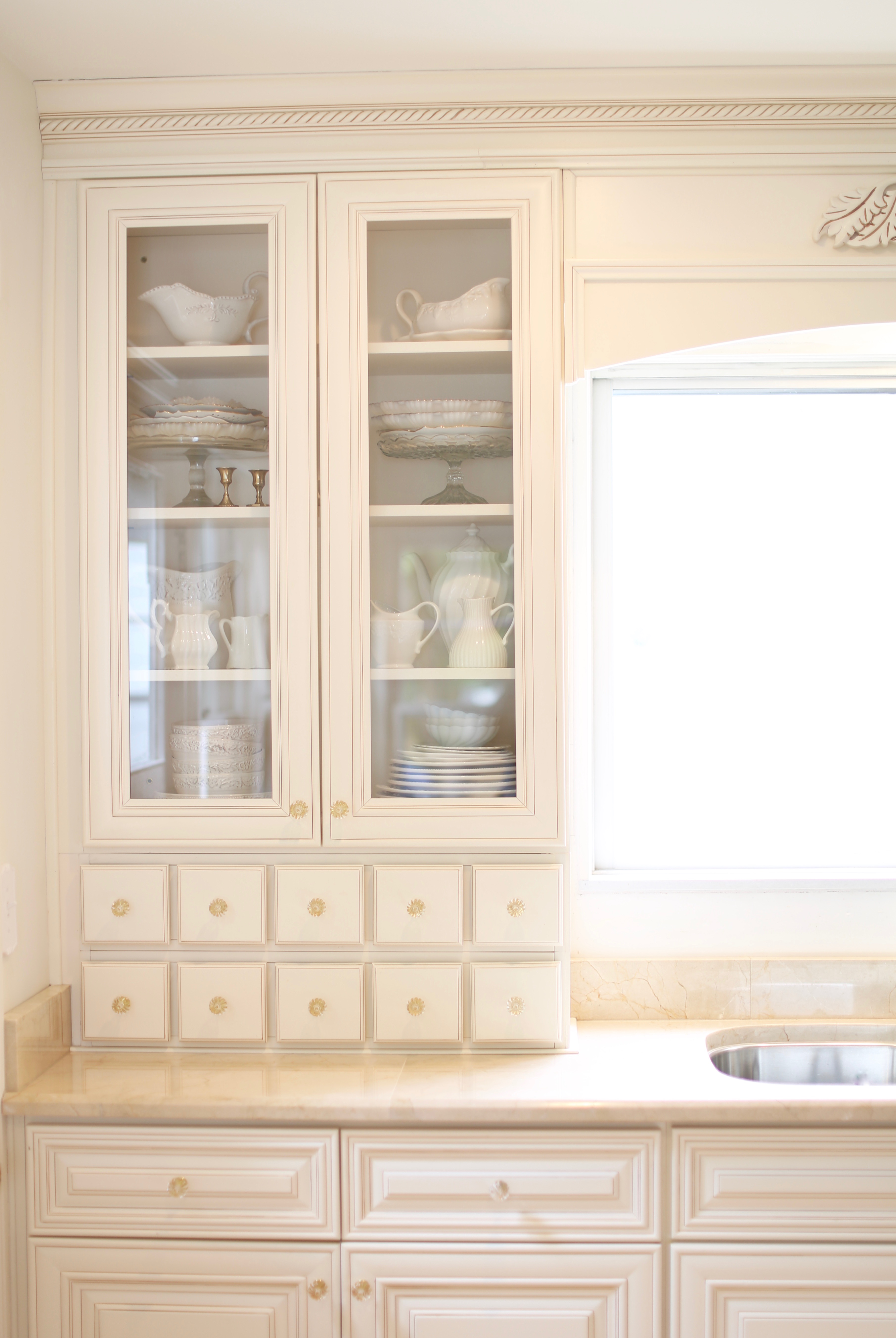I picked out ornate cabinets and custom-ordered the details on the island. It turned out lovely! The buffet in the kitchen has been passed down from my parents. It was also in Jess’s and my wedding, and it’s very special to us.