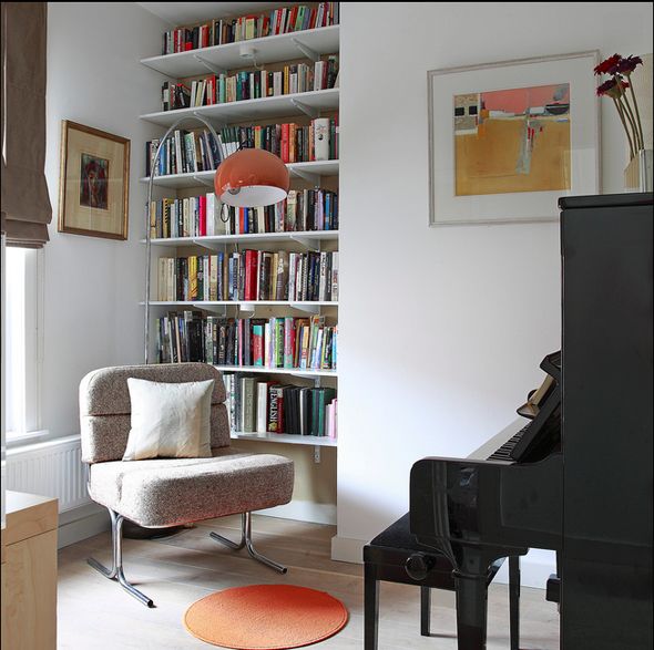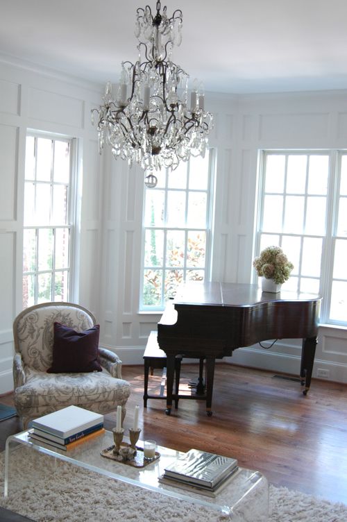 A bit of a fancier take on the piano room, with the gorgeous chandelier and candles on the coffee table. I adore this look for a music space as well, and I think combing elements from this photo with the one above could potentially create a cozy, yet almost-formal feel for a usable piano studio. And can we just take a few moments of silence to appreciate those windows? Windows make me so happy — they’re definitely on the prerequisite list for my future little cottage!