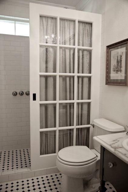 A door with windowpanes as a shower closure?! Totally smitten, my darlings. And those little black and white tiles are just classic vintage enough to break up a bit of that white that I like so much.