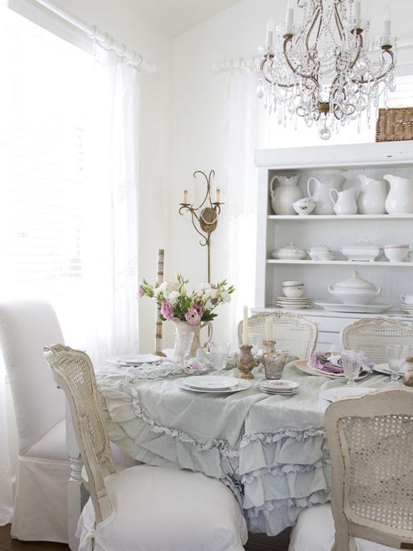 This appeals to very girly-girl nature of my personality. Still keeping with the white theme, but adding just a dash pink is noticeably feminine. And those chair covers and ruffled tablecloth? Perfect for entertaining guests for brunch or a mid-afternoon caffeine fix. The chandelier in this room is quite similar to the one in the previous image, and I like that it adds just a bit of class — enough to make the rooms less trendy and more timeless, but not enough to take it old school Victorian.