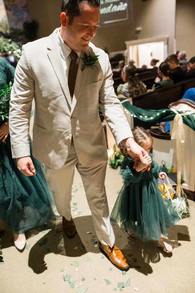 CA: Yes! A funny moment was, as the bridal party was walking out, one of my flower girls (Coraline, age 3) did not want to leave and started crying and refusing to walk. Ana, the other flower girl, tried to get Coraline down the aisle which then prompted a small fit. Lucky Coraline’s father (who was also in the bridal party) swept in and scooped Coraline up and all was well. Thankfully the photographer captured the funny moment on camera. I giggle every time I look at the pictures.