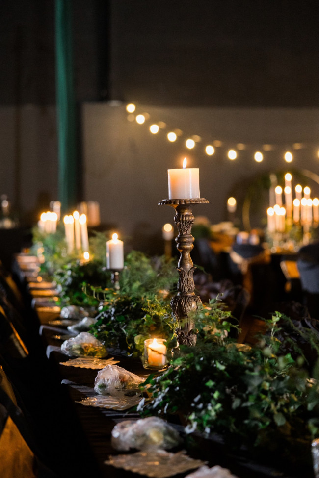 CA: At first, I wouldn’t say I really had a theme - or at least I thought I didn’t. All I knew is that I wanted tons of greenery and string lights. While wedding planning, I ended up collecting tons of gold and brass candlesticks of all different shapes and sizes, which ended up being my favorite part of the wedding decor. I decided after the wedding to keep my favorites and now use them as decor for our home (which is so special to see daily). By the time it was all said and done I would say the theme/vibe ended up being something like garden party.