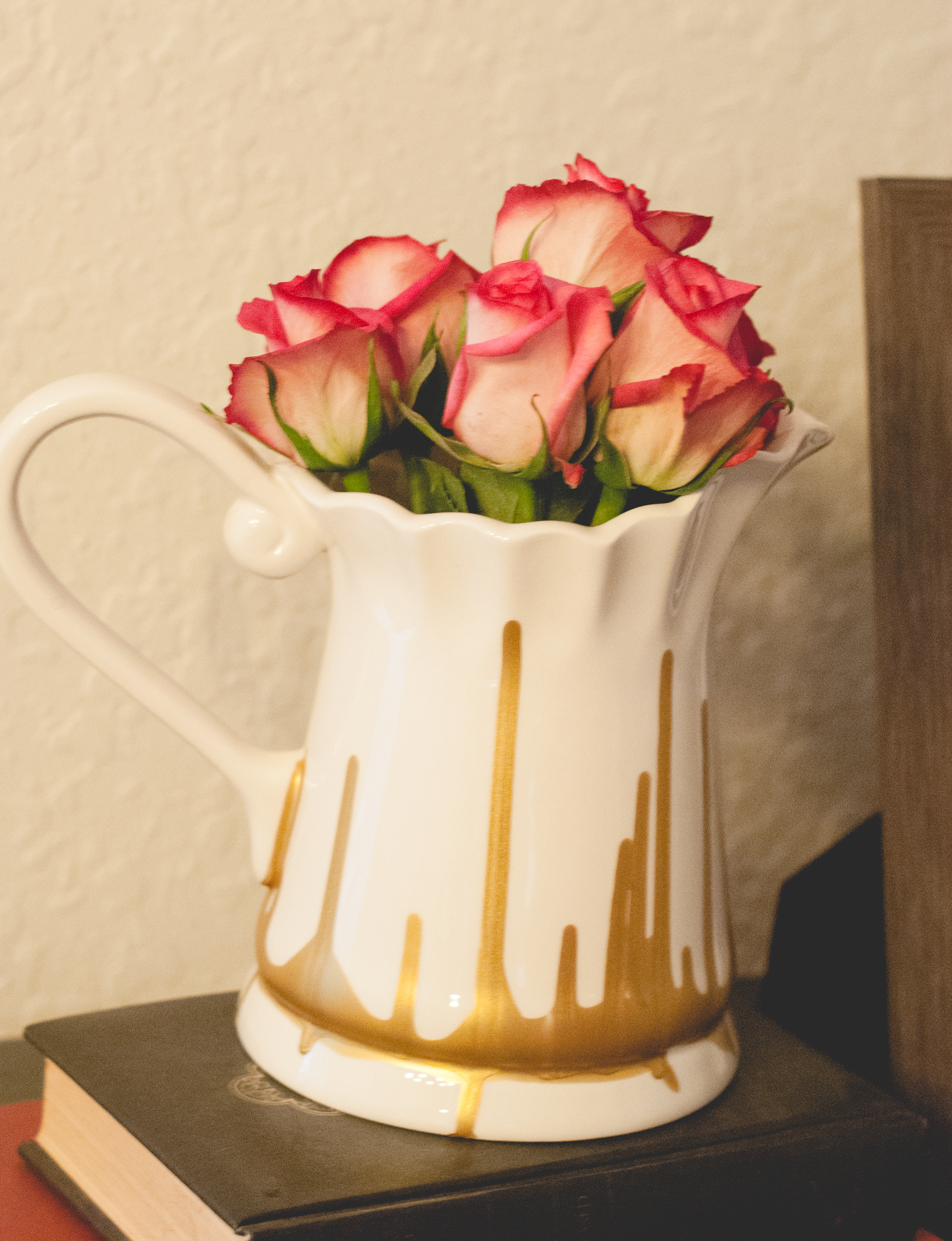 While the pitcher is gorgeous on its own, I really wanted to add some type of flair or color to it so it stood out from the wall it would sit in front of. I seriously debated this after looking on the bottom of the pitcher and seeing the date “1934” etched on the bottom. I figured it had lived a good long life and I may even be its final owner. I took the plunge.