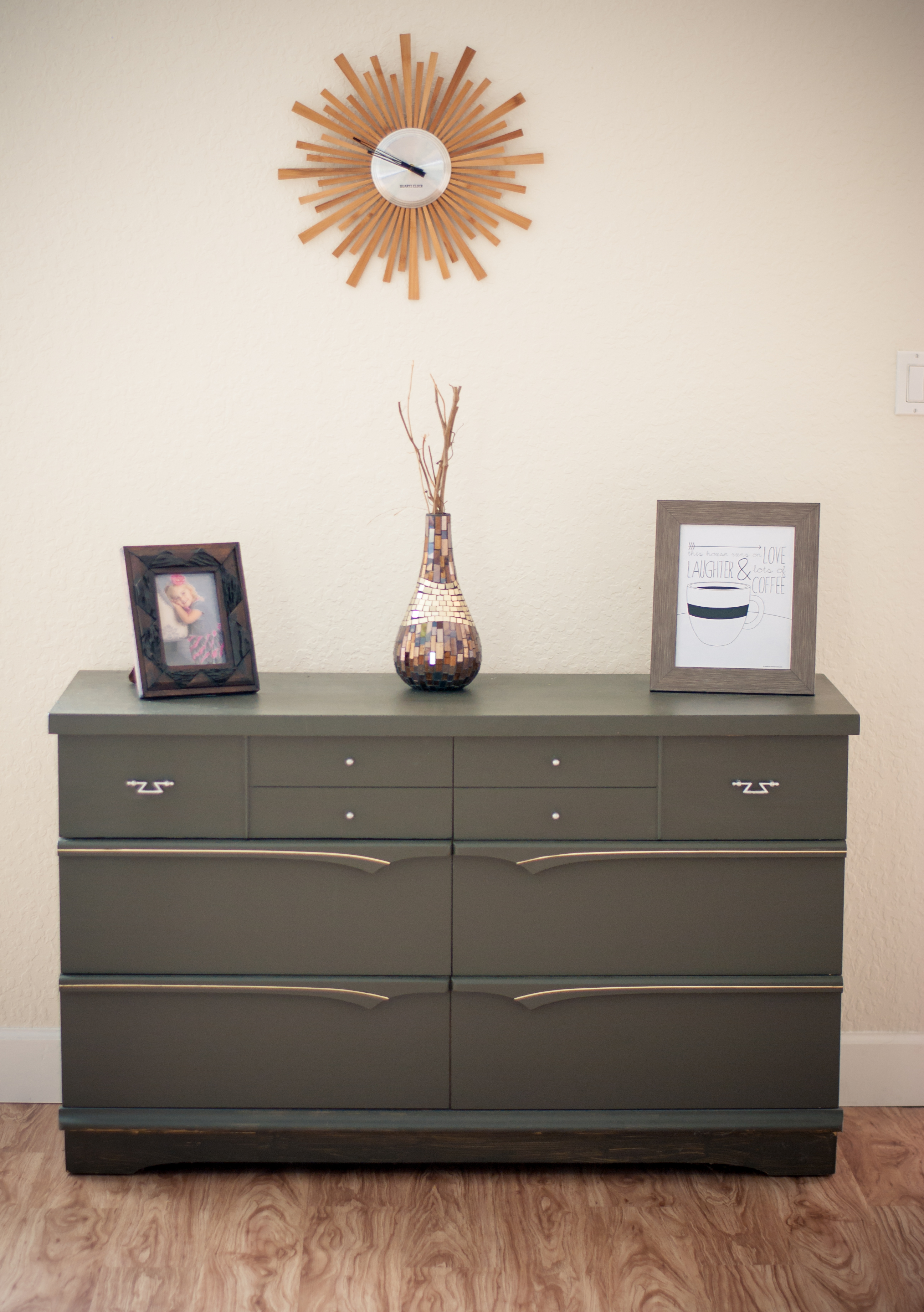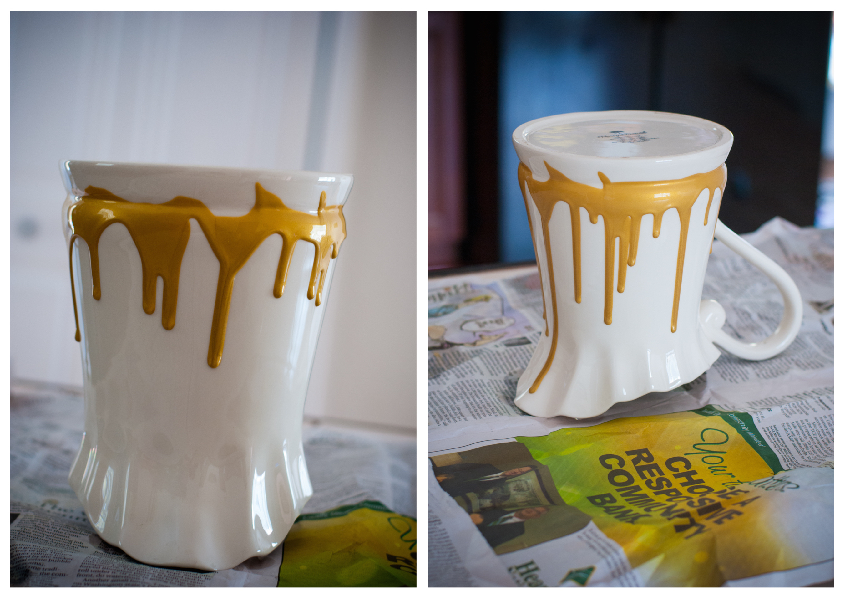 I had some metallic gold Martha Stewart craft paint laying around and decided to go for a dripping look. I lined the bottom with gold paint and let it drip for about 45 minutes and then I turned it right side up to dry. I didn’t want it to look perfect. I wanted it to be art and I am thrilled with out it turned out.