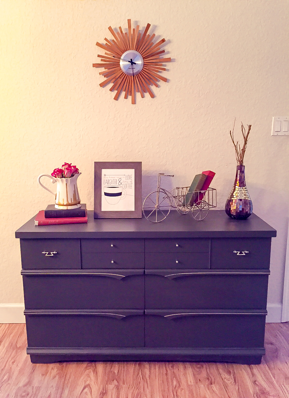 Let’s talk about the most boring area in my home: my dining room buffet. I have stared at this area for a while now with little to no inspiration on how to spruce it up, until the Anthro Home catalog came. The issue is full of flowers being displayed in unexpected ways like in a pitcher or a tea cup. I loved it, but hated the price tag. You know me, I’m always looking for a bargain.