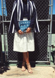 The navy, grandad collar shirt with subtle stripes and white, lace skirt from JCrew are somehow subtilized by the fact that they exactly match the colors of the jacket.