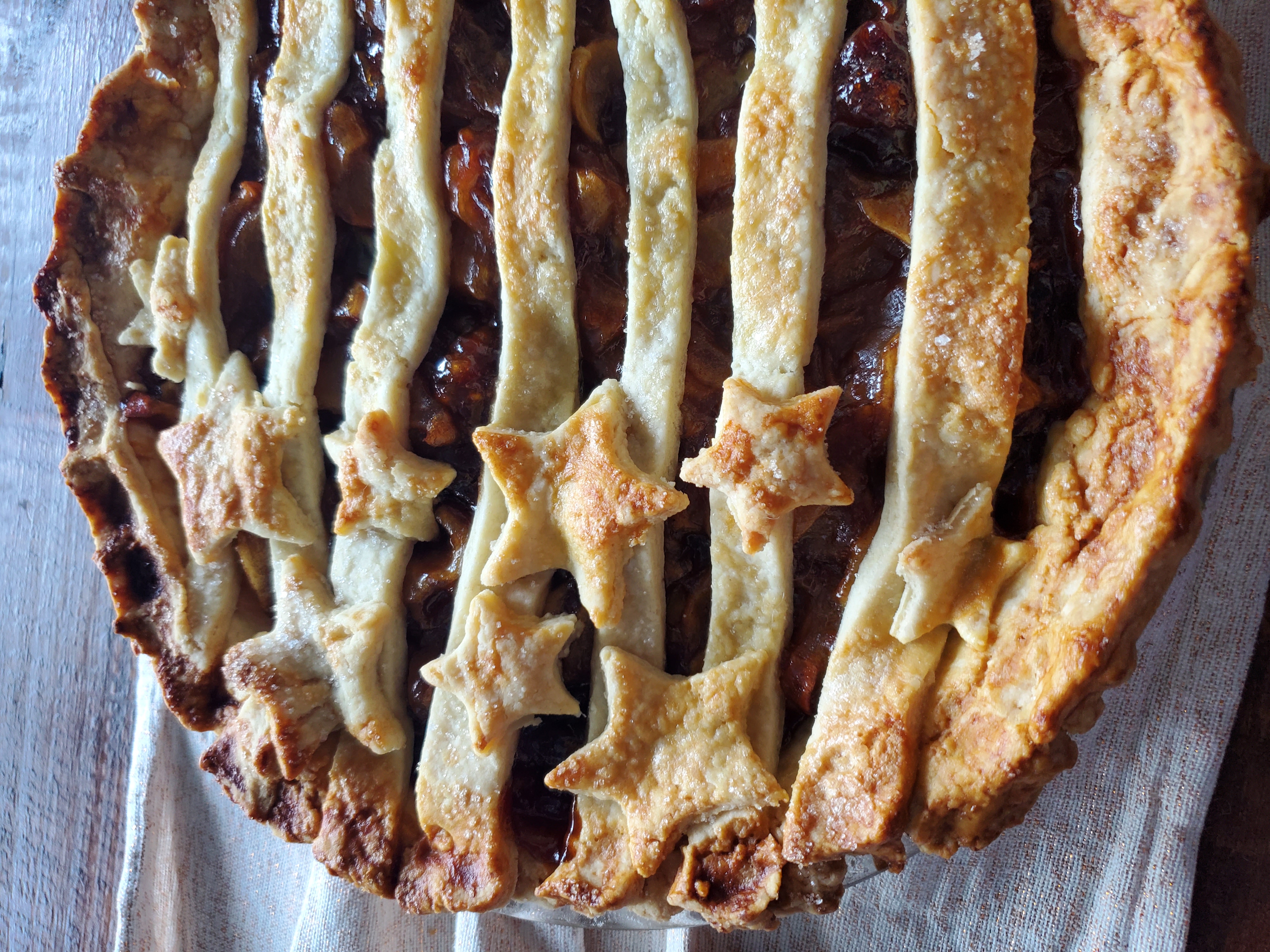 Lower the temperature to 350 and bake for 40 minutes or until golden brown. During this second baking time you may want to cover the pie edges with foil to prevent them from burning, I used a silicone pie crust protector.
