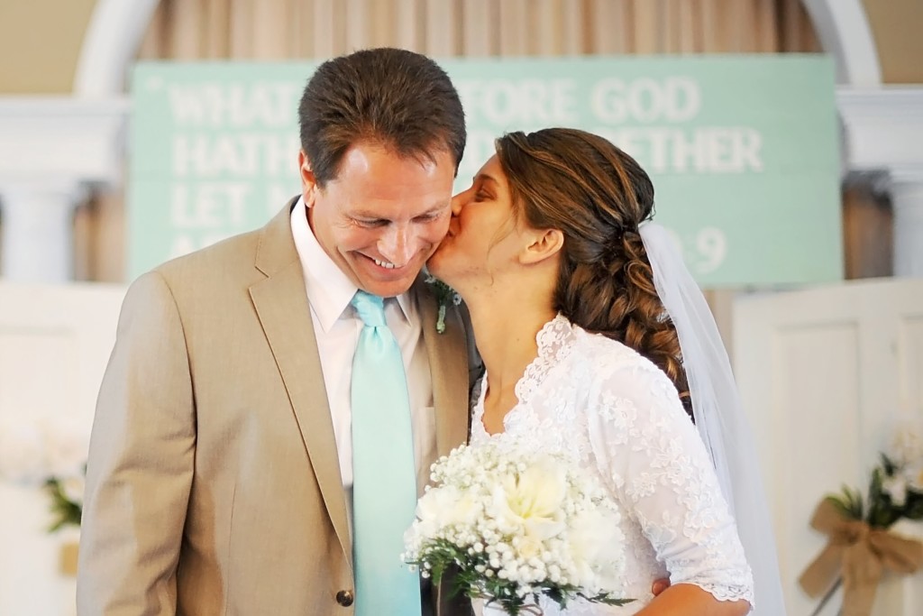 We finally settled on June 20, 2015, and I was so thankful to have so much time to plan, because I was able to have a largely DIY wedding. This not only saved a lot of money for my parents, but it was exactly what I wanted. The only word I can think of to accurately describe the style of our wedding is “eclectic.” We drew from so many styles and ideas to make the day reflect us and our personalities perfectly. I love anything classic and vintage, and that showed in much of the décor and my dress. It was a simple, all lace gown in a slim A-line style, with buttons from the neck to the end of the train. I went with a chapel length veil to make it a bit more formal and dramatic. Both Robbie and I are lovers of learning and reading, so we used vintage books throughout the wedding, and our cake rested on an antique desk. We incorporated a lot of rough wood and logs as a nod to the rustic theme and also to the fact that my father and all of his family are loggers. It is the way I grew up and it is a huge part of my life. My dad cut all the wood that we used in the wedding and at the reception himself. I was even able to work in my love of football, and had some fun with pictures. Perhaps most importantly, I was able to use many unique antiques in the décor that belonged to family members and that had a lot of meaning to me. The most significant was a Bible that belonged to my great-grandfather who was a great evangelist, Bro. Paul Russell.