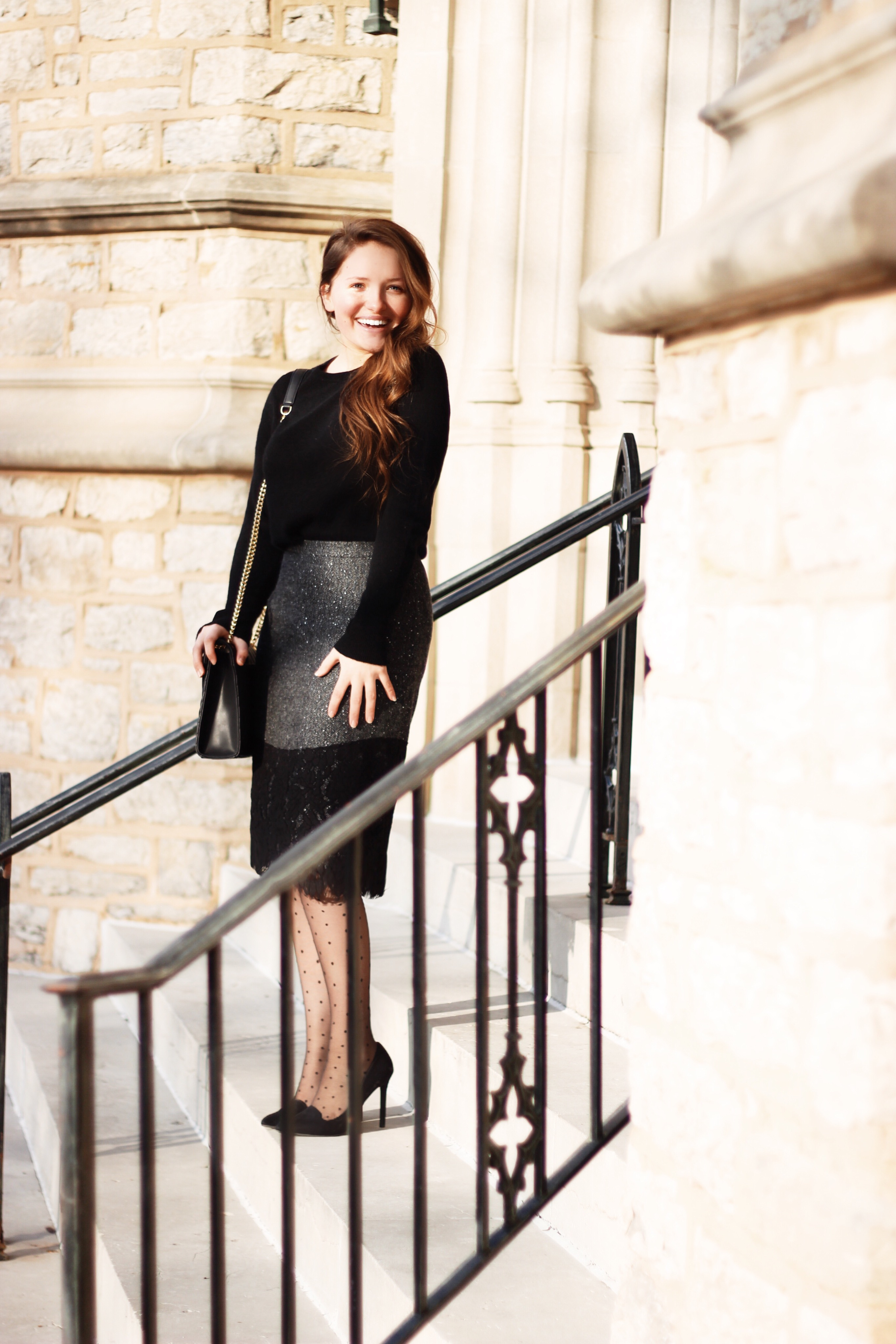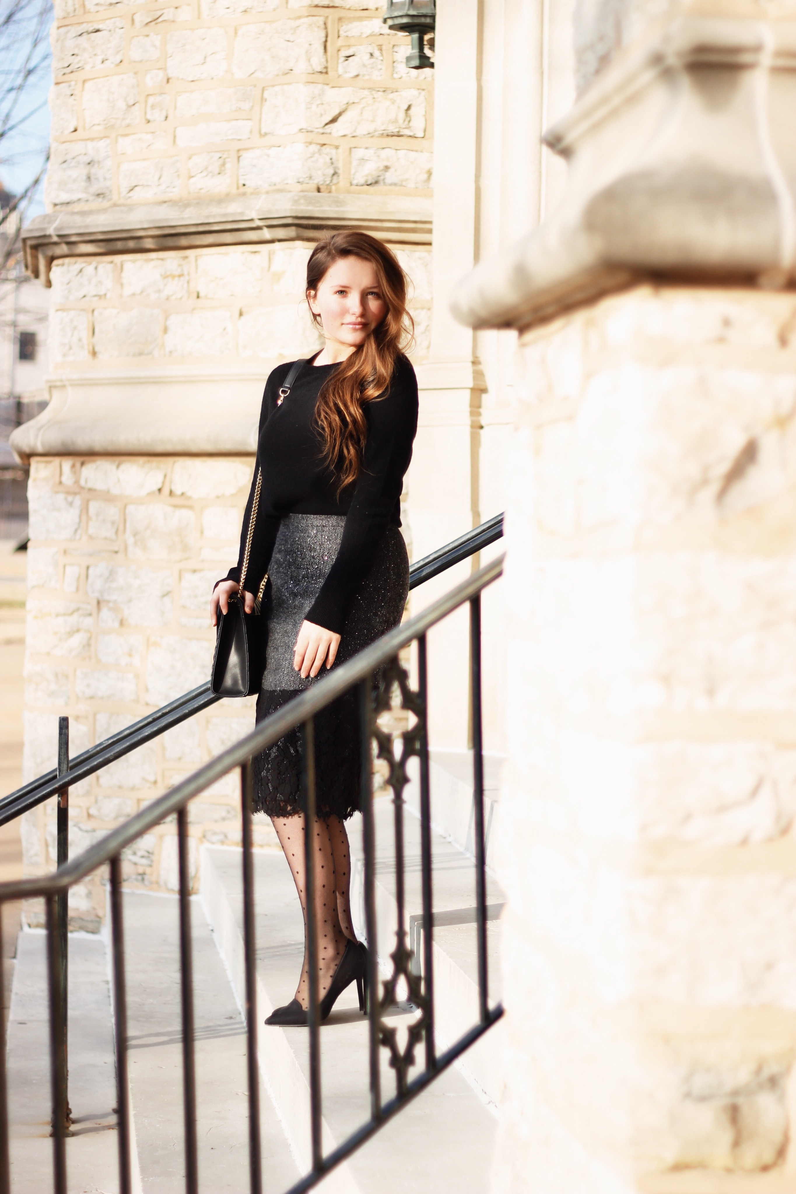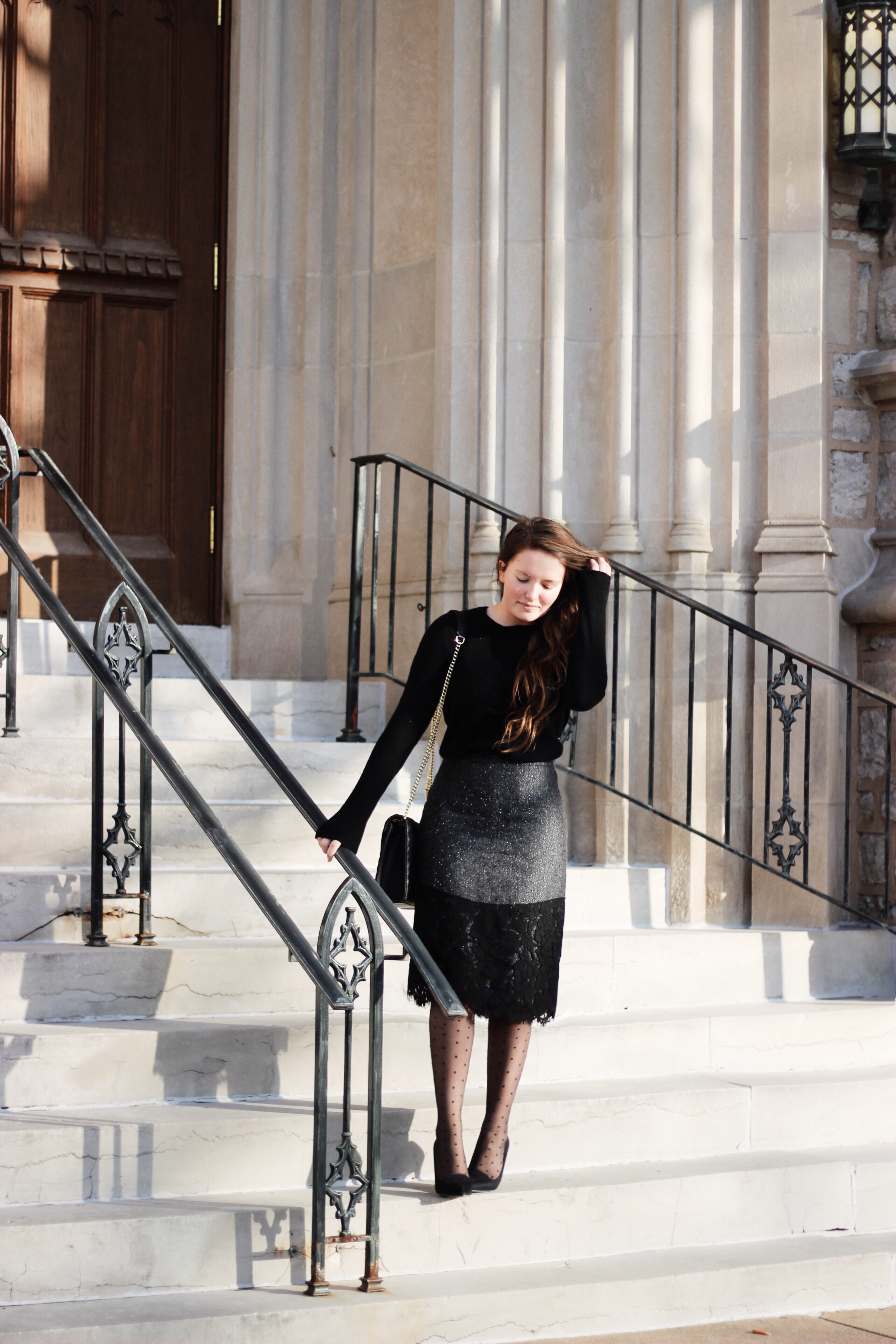 The star of the show in this outfit is this J.Crew skirt that I received as a Christmas gift. The detailing is absolutely beautiful. The top is covered in little jewels that sparkle and the bottom is covered in the most intricate, gorgeous black lace. This unique skirt is currently on sale which is a bonus!