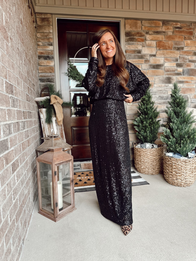 Heather is pictured here in the All That Glitters dress - an absolutely stunning, sparkly maxi dress. Heather accessorized with gorgeous leopard heels for an elegant look.