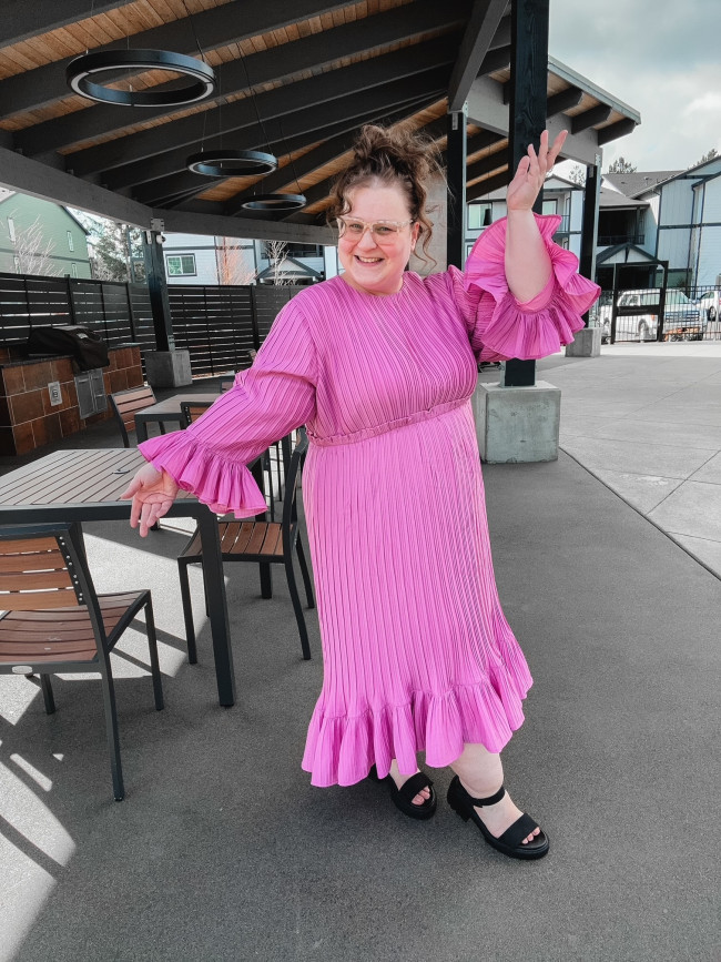 Need the perfect brunch date dress? Kristen Caum suggests this one - a pleated pink midi that's completely feminine and flattering.