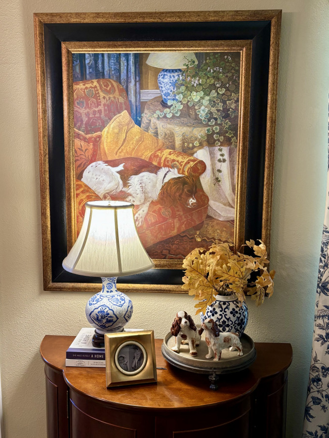 Something to keep in mind when collecting decor pieces is how you might use them in unexpected ways. For example: here you see a thrifted silver mail holder that my mom has used to display vintage books. I’m not sure if I would have thought of that right away myself, but it’s such a clever idea!