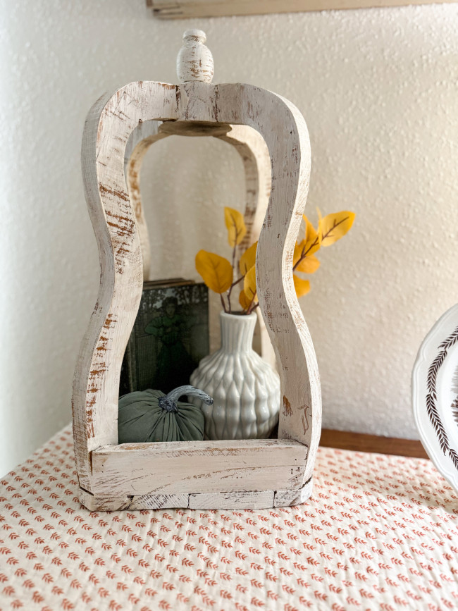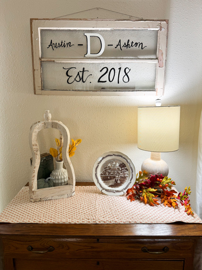 More simple but cozy touches of fall! This white-washed wooden cloche was given to me by my mom, and it’s a great staple piece that can be changed up for each season. I already had the two vintage books in there during the summer, but switched out this light blue vase with yellow leaves for the vase and greenery I had in there previously, and added a pumpkin.