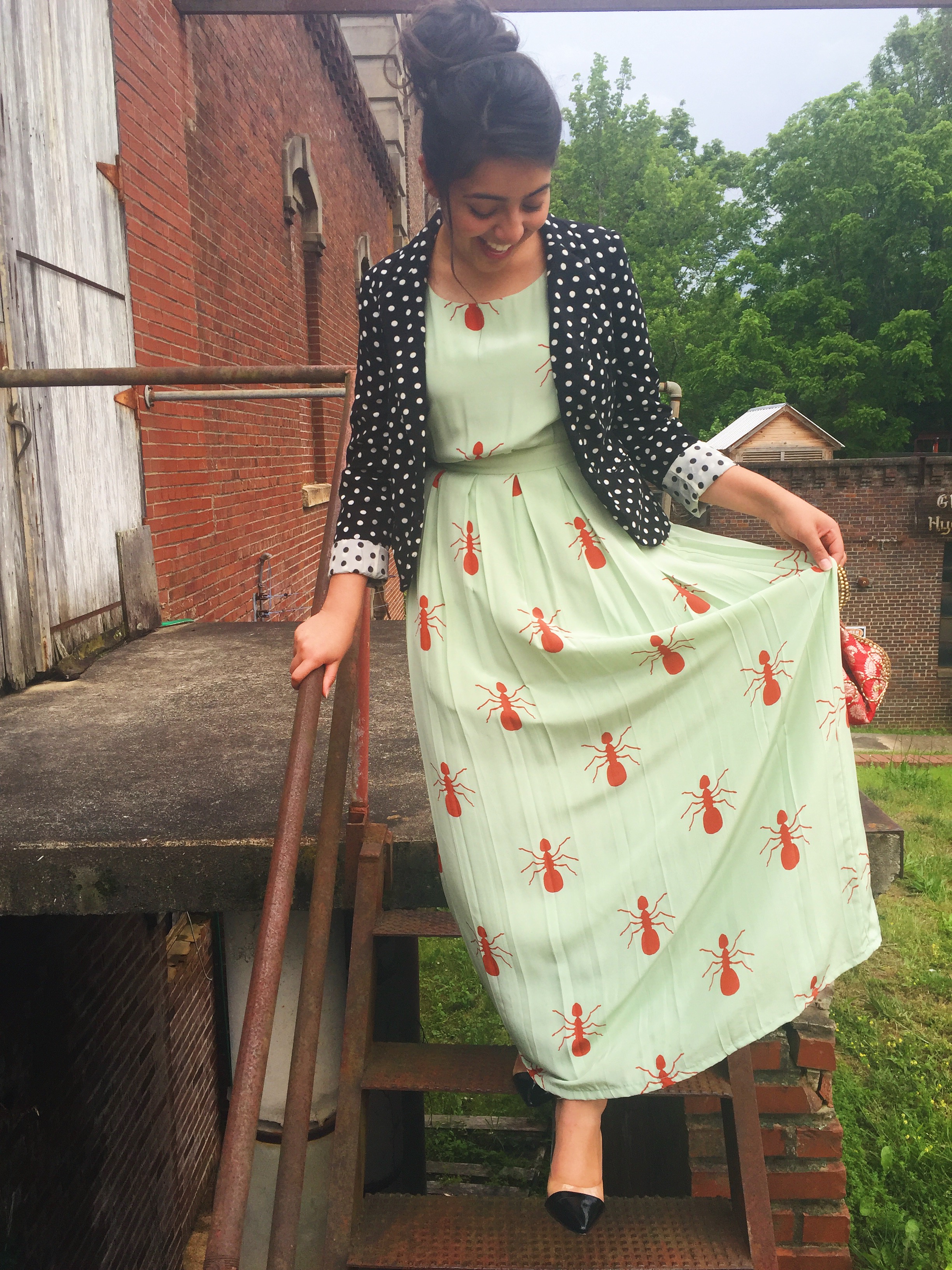 One of the hardest choices I had to make with this dress (since it is sleeveless) was whether to layer over the dress or under the dress. I have tried adding a simple cream button down blouse underneath with a glitzy gold collar, and this usually worked with some gold heels. However this Polka dotted blazer is definitely my new favorite piece to layer with this dress. The polka dot pattern doesn’t take away from the ant pattern, and since it is in a simple black and white, it creates some balance for the dress.
