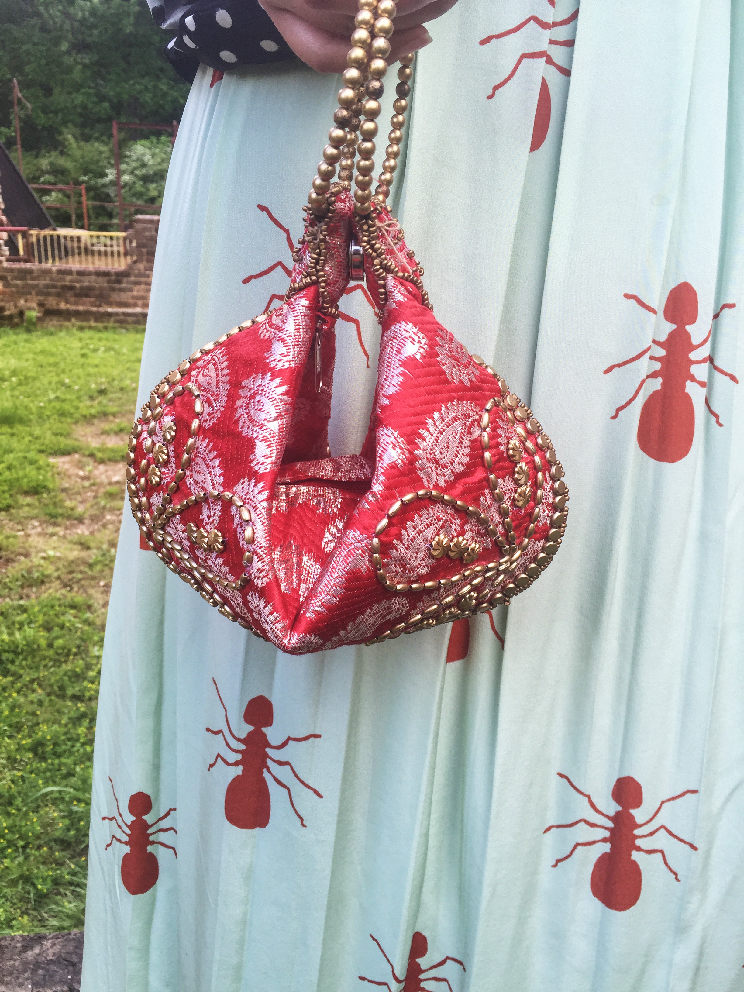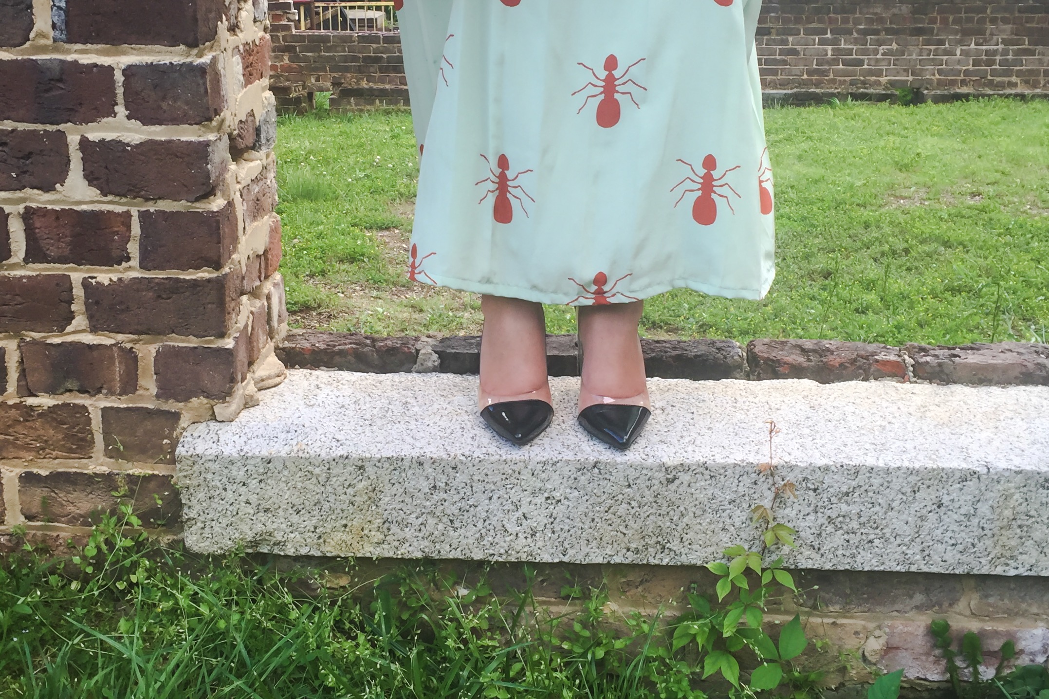 How fun is this maxi dress!? The red ants crawling on it makes me think of spring picnics at the park and croquet on the front lawn. Where is my lemonade and strawberry tart? This silk dress guarantees an immediate happy boost when I slip it on! The muted green color is perfect for spring and downplays the funky red ant print. This Charlotte Taylor Fire Ants Maxi dress was a lucky find from a few years ago!
