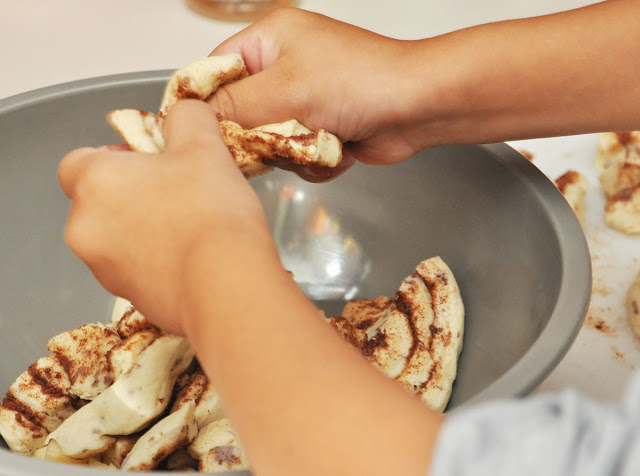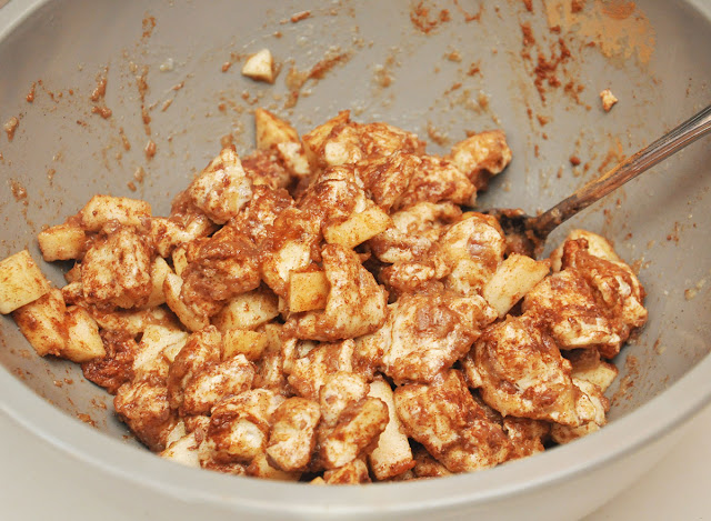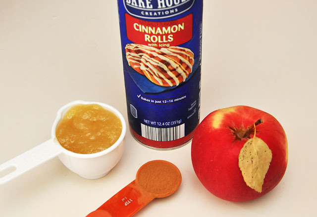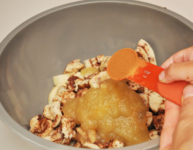 This next part is so easy, you can let your kids help! Dump the apples into a medium bowl. Add in the cinnamon roll pieces, apple sauce, and cinnamon. It will smell amazing.