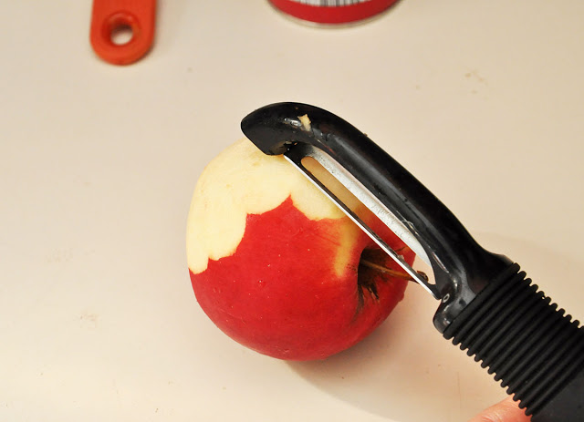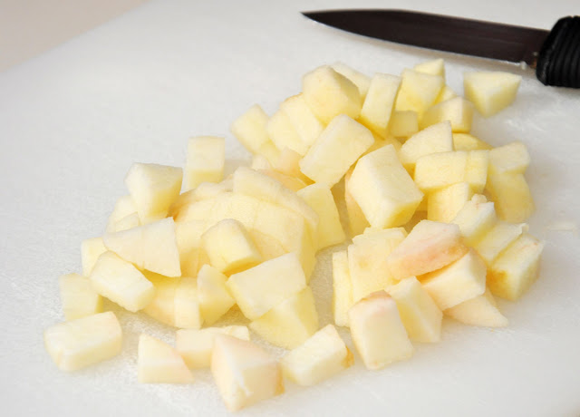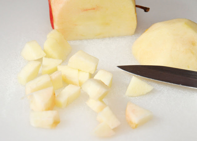 First, peel the skin off the apple. Then dice into bite-size pieces.