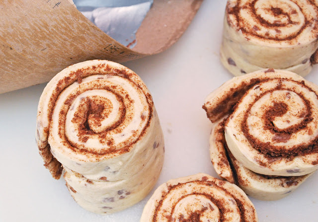 Next, pop the cinnamon roll container and unroll that delicious dough. Set aside the frosting packet for later. Cut each cinnamon roll into bite-size pieces.