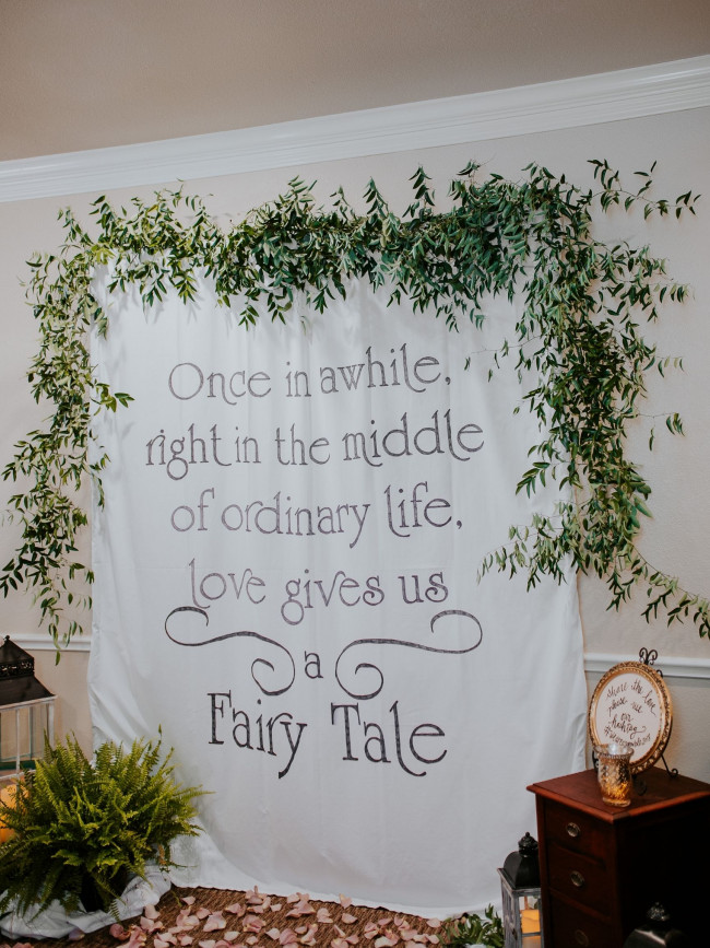 As our guests entered the foyer of our church, I wanted it to feel like they had stepped into the pages of our love story. For the main focal point of the room, we recreated our proposal scene. Austin’s mom had stenciled this quote (which was so fitting for our theme!) onto a white backdrop, and they hung it from the trees in the woods surrounding their home, with the path leading to it lined with candles and Christmas lights. We brought this outdoor scene inside by hanging the cloth backdrop on a stand and draping it in greenery. The lanterns and small end table (which was the first piece of furniture we bought for our future home) were also a part of the original proposal backdrop.