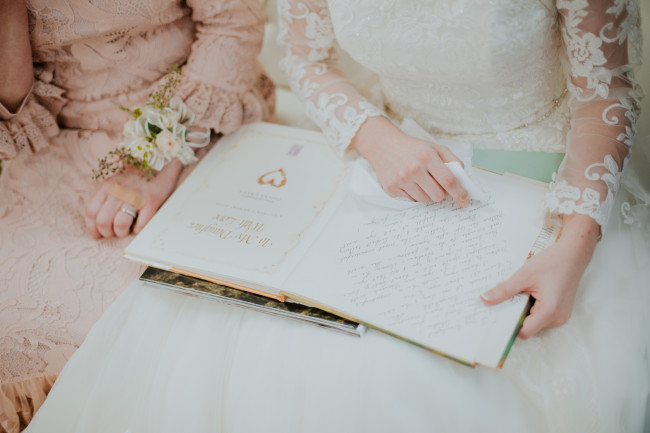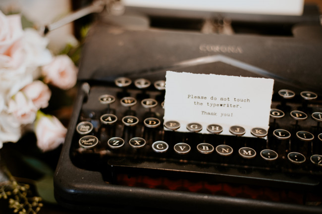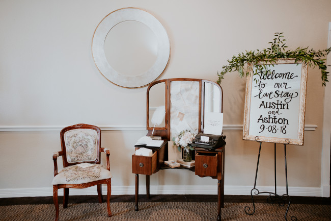 This guest area was filled with many more bookish details. My favorites were the 100-year-old typewriter that belonged to my aunt’s grandparents, our programs that I designed to look like little books and tied with dusty blue ribbon, and the mirror painted with the words “Welcome to our love story."