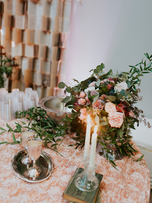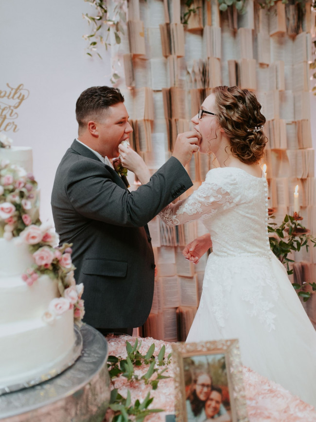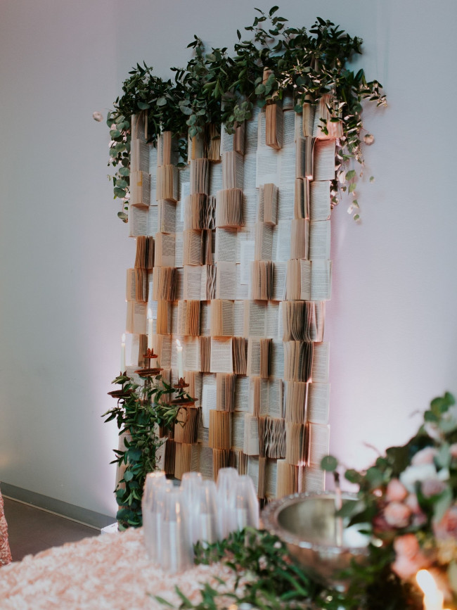 All of these lovely details gave the reception a striking, elegant look, but the real star of the design was our cake and punch table area. For this space, we built a wall of books! We ordered bulk quantities of old paperbacks online and used a staple gun to secure them to a piece of plywood. This thing was a monster to transport, but it was the perfect crowning jewel for our bookish theme.