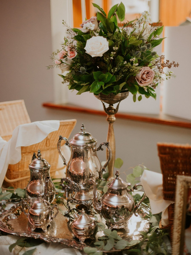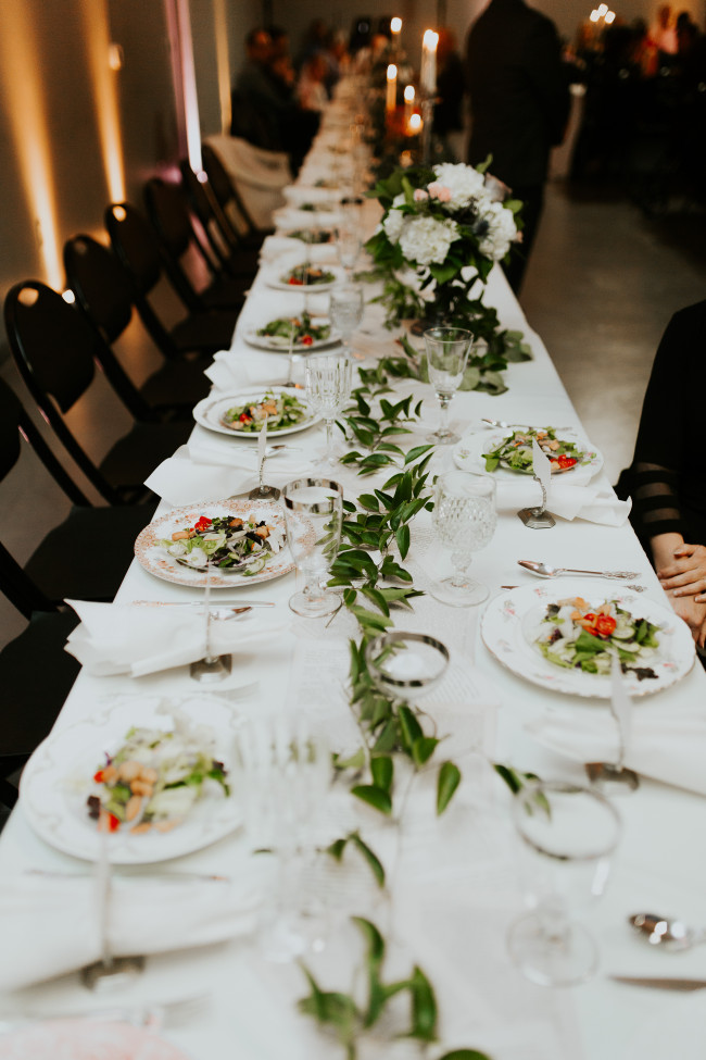 I wanted to give this space a romantic, elegant feel. The tables were arranged in long rows, banquet style. Atop the ivory tablecloths we layered branches of greenery over bookpage runners that I made. For the centerpieces, we used stacks of old books with an assortment of silver candelabras and silver pitchers filled with fresh flowers. My mom and I had so much fun hunting down these beautiful silver pieces for great prices in resale shops and antique stores! To this day, I can’t go into one of those stores without my eyes automatically hunting for anything silver.