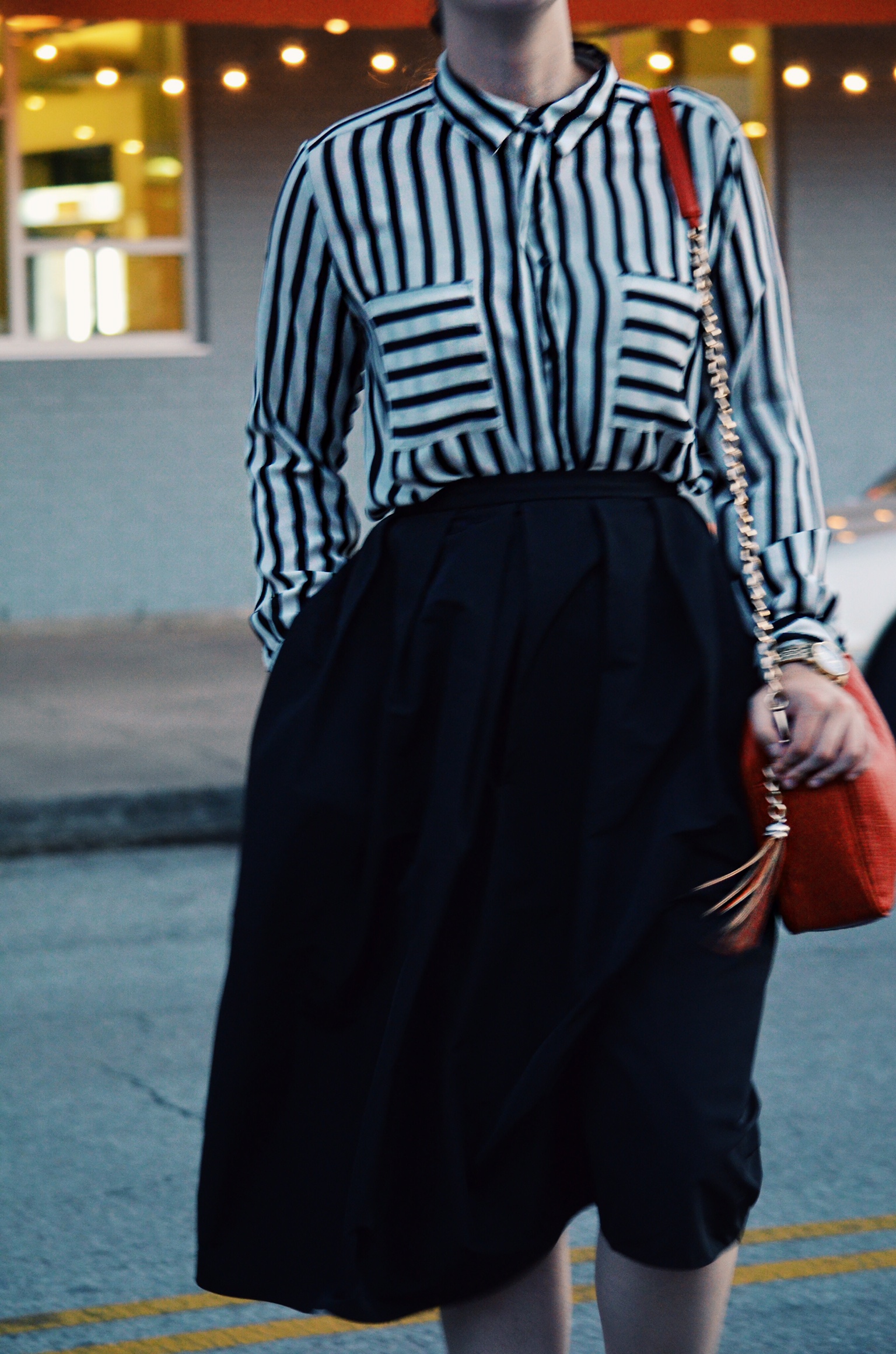 This was an effortless outfit. I threw on one of my favorite striped shirts, a fit and flare black midi-skirt that I purchased from Dotsy’s Boutique, and color-matched my accessories, the purse also from Dotsy’s Boutique and the shoes from Steve Madden.