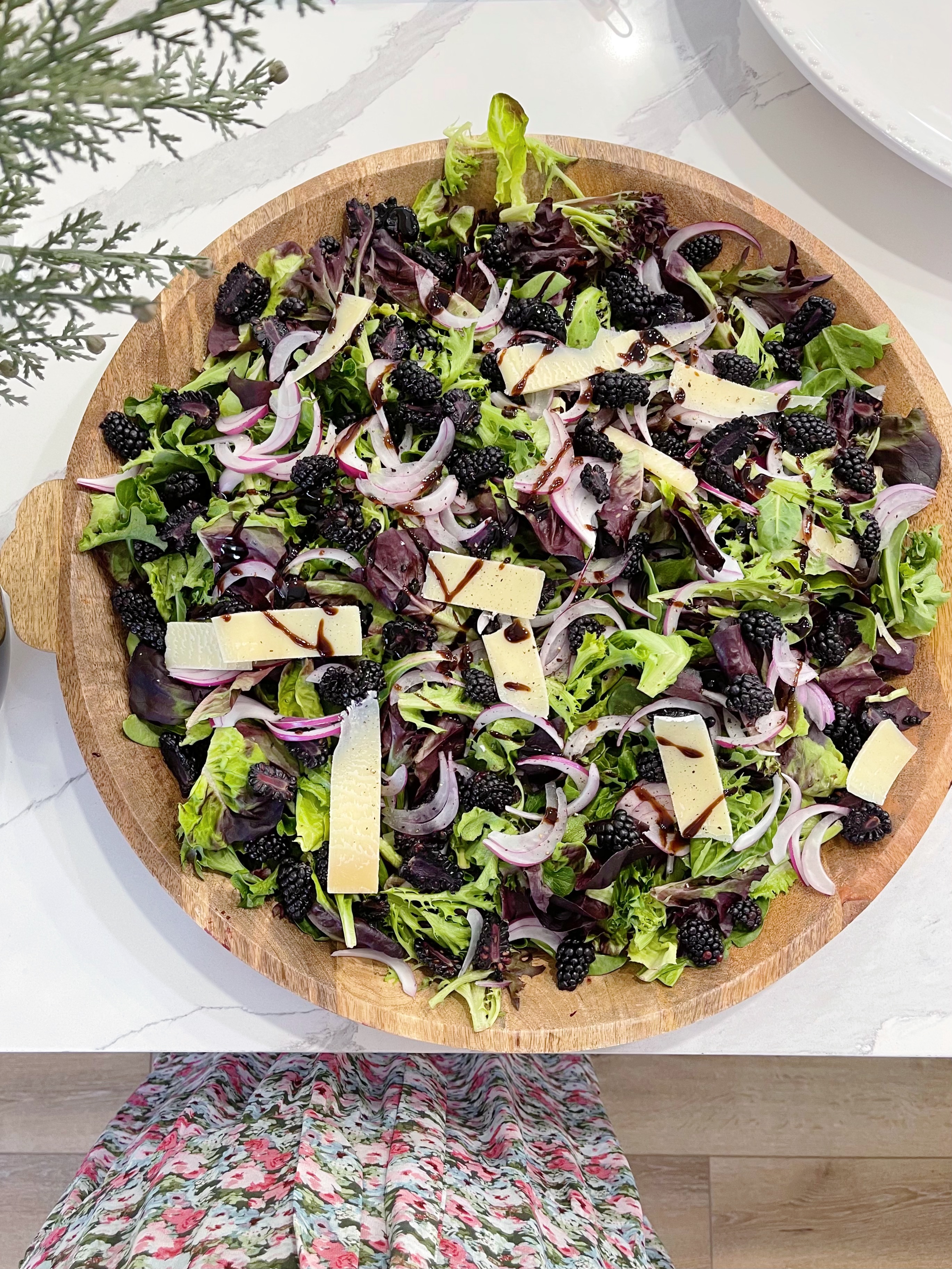 SALAD INGREDIENTS: 1 large (16oz) bag of Spring mix greens, 1 (12oz) box of fresh blackberries, 1 cup parmesan cheese (shaved with a potato peeler), 1 cup of thinly sliced red onion or shallots, drizzle of balsamic glaze, salt and pepper to taste.