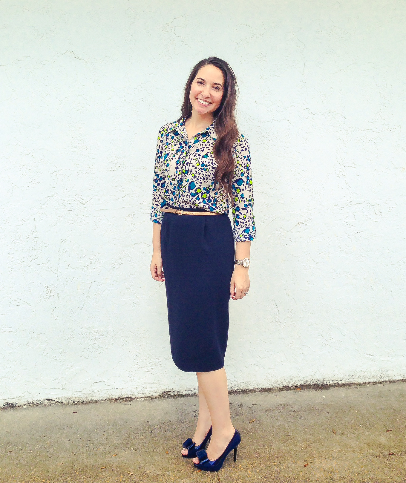 When I saw a neon green and turquoise animal print top marked $2.99, I loved it! And bonus, it was navy – not black! I had another opportunity to wear my navy pencil skirt I found at Salvation Army for $1.50. And yes, I wore my blue Nine West pumps again. What can I say? I’m a creature of habit and a lover of bow front heels.