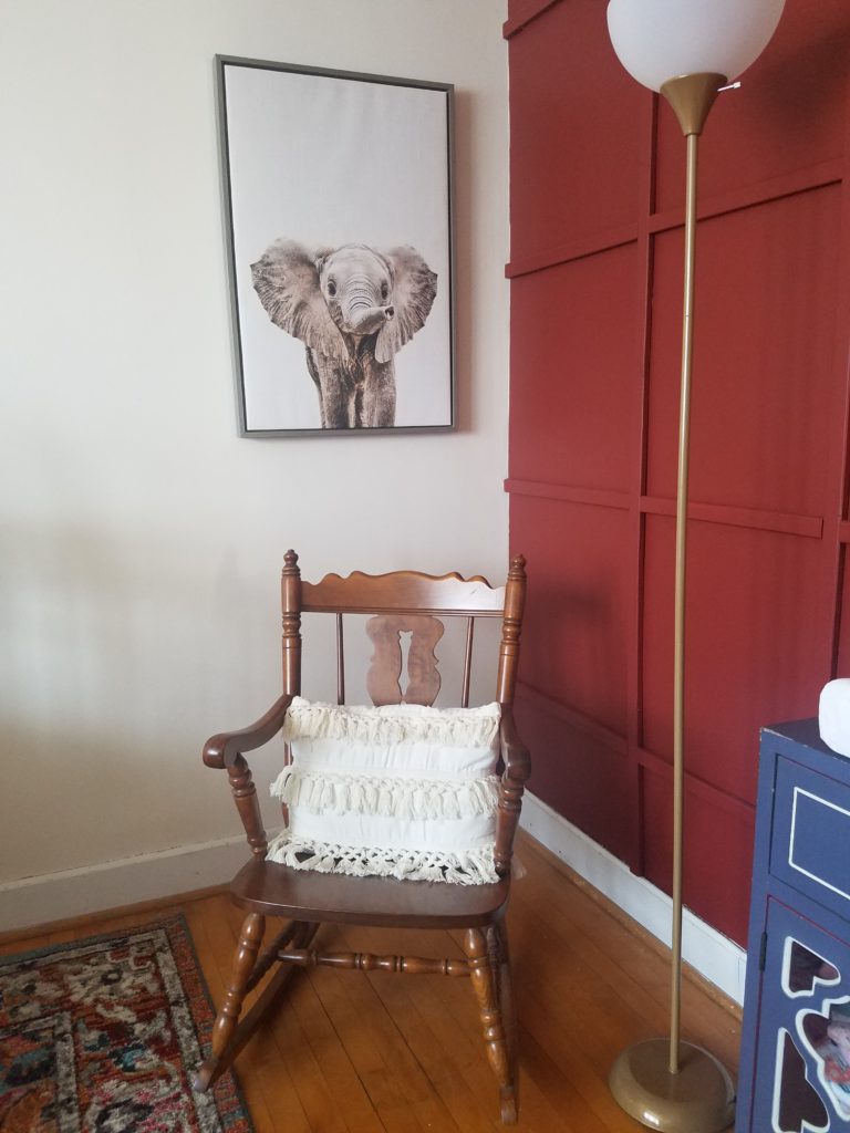 The rocking chair was given to us from my husband’s grandmother, and the tassel pillow ties this otherwise traditional piece right in. The elephant canvas is from Home Goods (which you’ll soon realize is one of my favorite places!) and the light is a $5 Wal-Mart find.