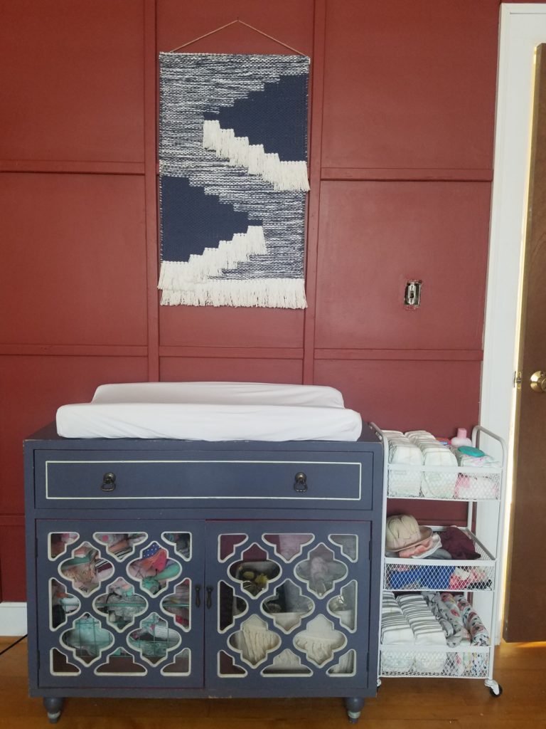 I bought this dresser from Home Goods a few years ago in college, and it’s the perfect size for a changing table! The wall tapestry is from Target, and it used to hang in our master bedroom. Take a look around your home and see if certain pieces might work better in another space. *Ignore the missing switch cover; we bought all new ones and just need to put them on!