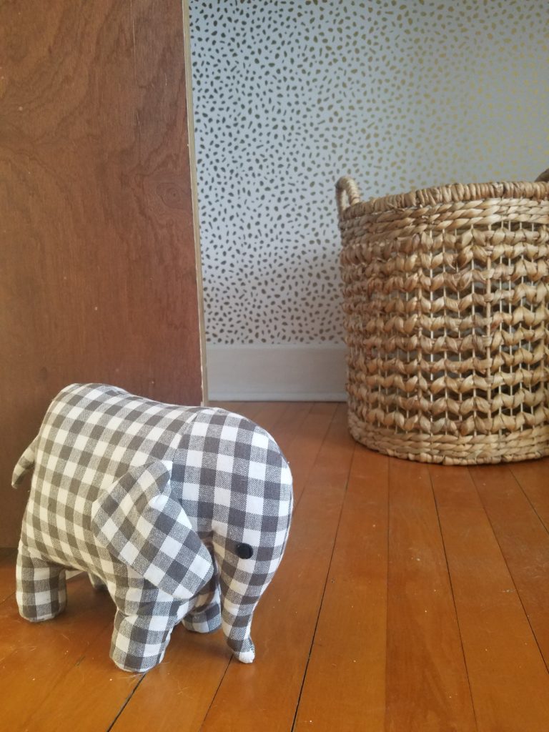 I wanted to make the closet fun, and I found the cutest peel-and-stick metallic wallpaper from Target. It’s fairly easy to apply and really makes an impact! Peel-and-stick is the way to go. We painstakingly removed wallpaper from all four walls in this room, and I don’t recommend setting yourself up for that task! Peep the Dainty Jewell’s dresses on the end – I’m already starting to stock up for when she’s older. ?
