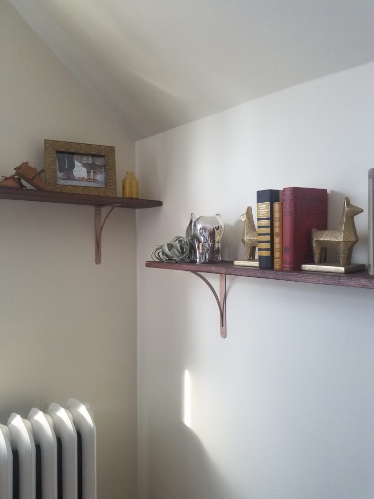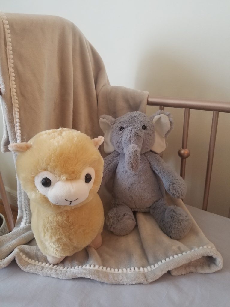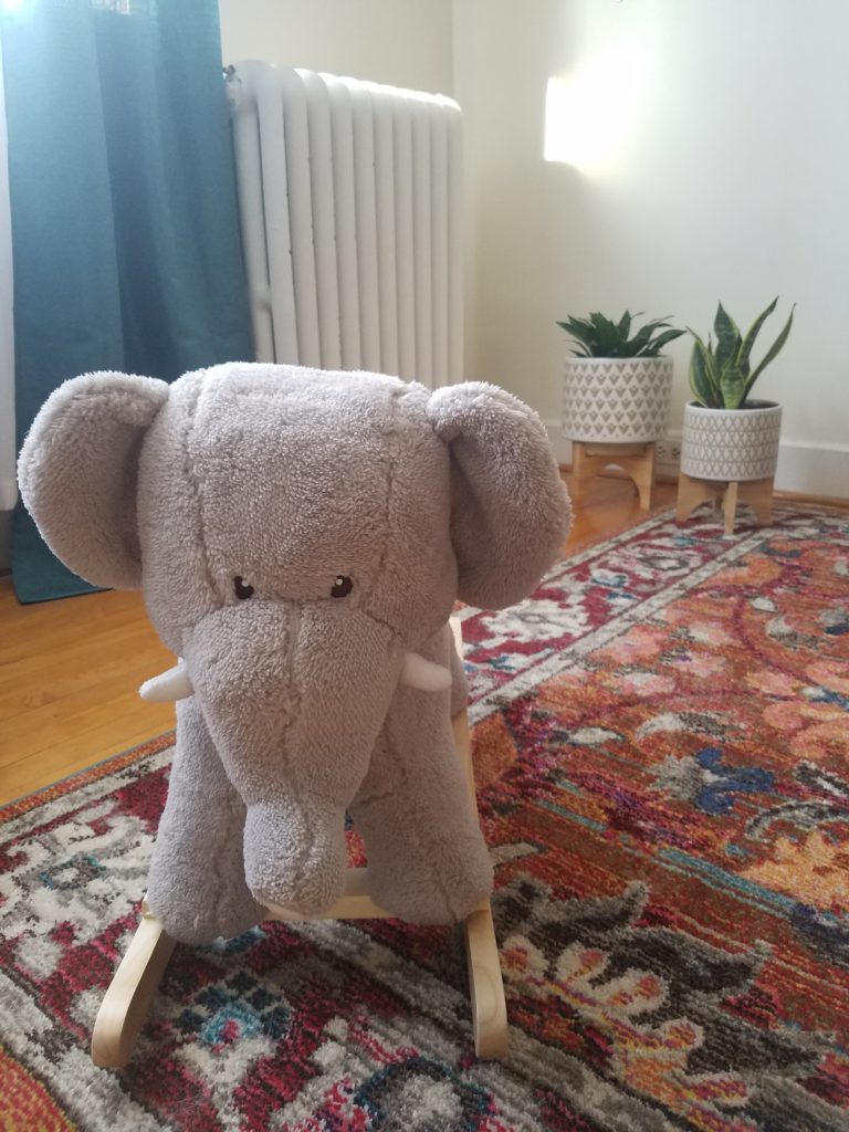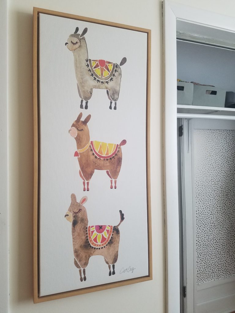 We bought this sweet elephant rocker last Easter from Wal-Mart, and I found these adorable planters at Home Goods just a couple of weeks ago. My husband made a couple of shelves, and I decorated them with trinkets from around the house and a few new items like the gold llama bookends from Hobby Lobby.