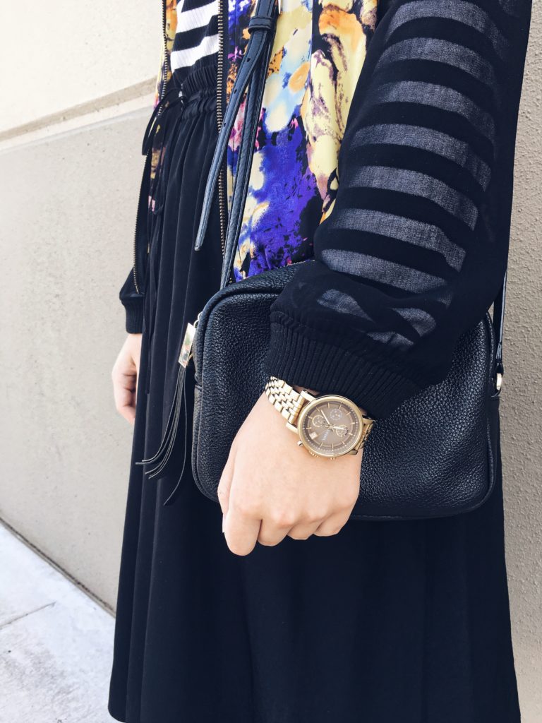 To finish off the look, I threw some of my trusty, black neutrals, a silky, black skirt from The Loft and a pair of lace-up, suede heels from Zara.