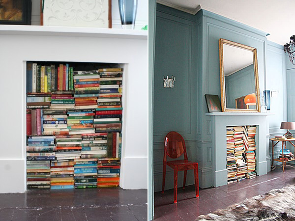 Storage in an empty fireplace? Brilliant! The good thing about books is that they can be easily stacked and stored in a variety of places. Look around your home, you just might find a surprising new place to store them.