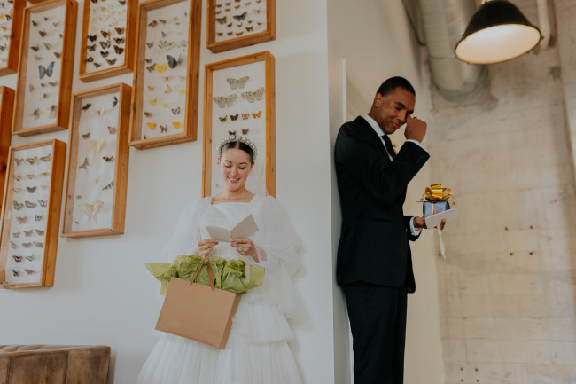 BM: Ethan and I decided to take communion instead of lighting a unity candle. Unfortunately, I forgot to buy bread and didn't realize it until we were on our way to the venue. I remembered my mom had bought the bridesmaids a sandwich platter from Subway, so I figured we could just use the bread from that. I'm not sure why, but I didn't think the tray was full of assembled sandwiches; I thought we would have all of the bread, meat, condiments, etc. to make our own sandwiches. It was only during our ceremony that I realized I was wrong. When we opened the bread up, we saw the bright red juice stain from a tomato that had been on the pre-made sandwich. We still laugh about it.