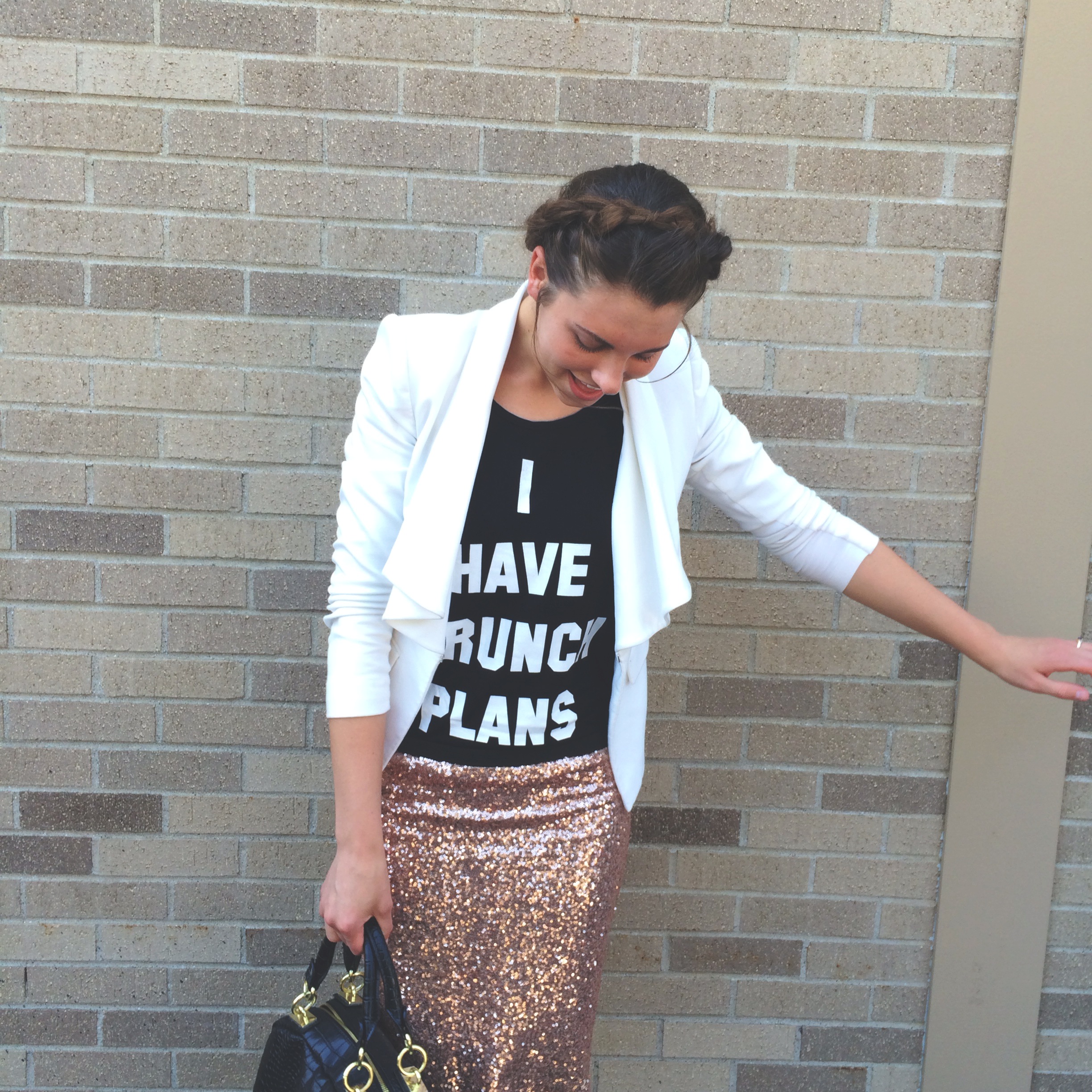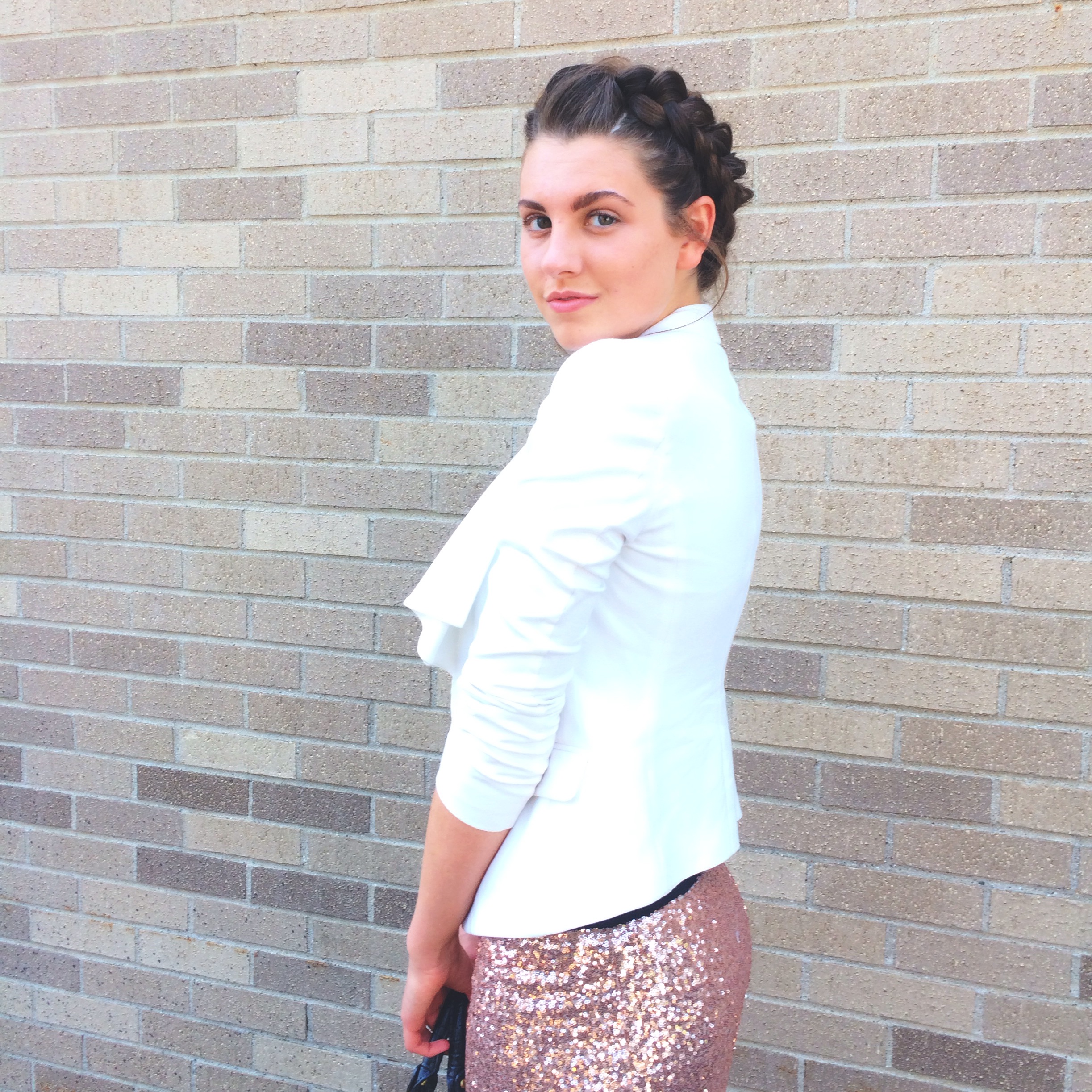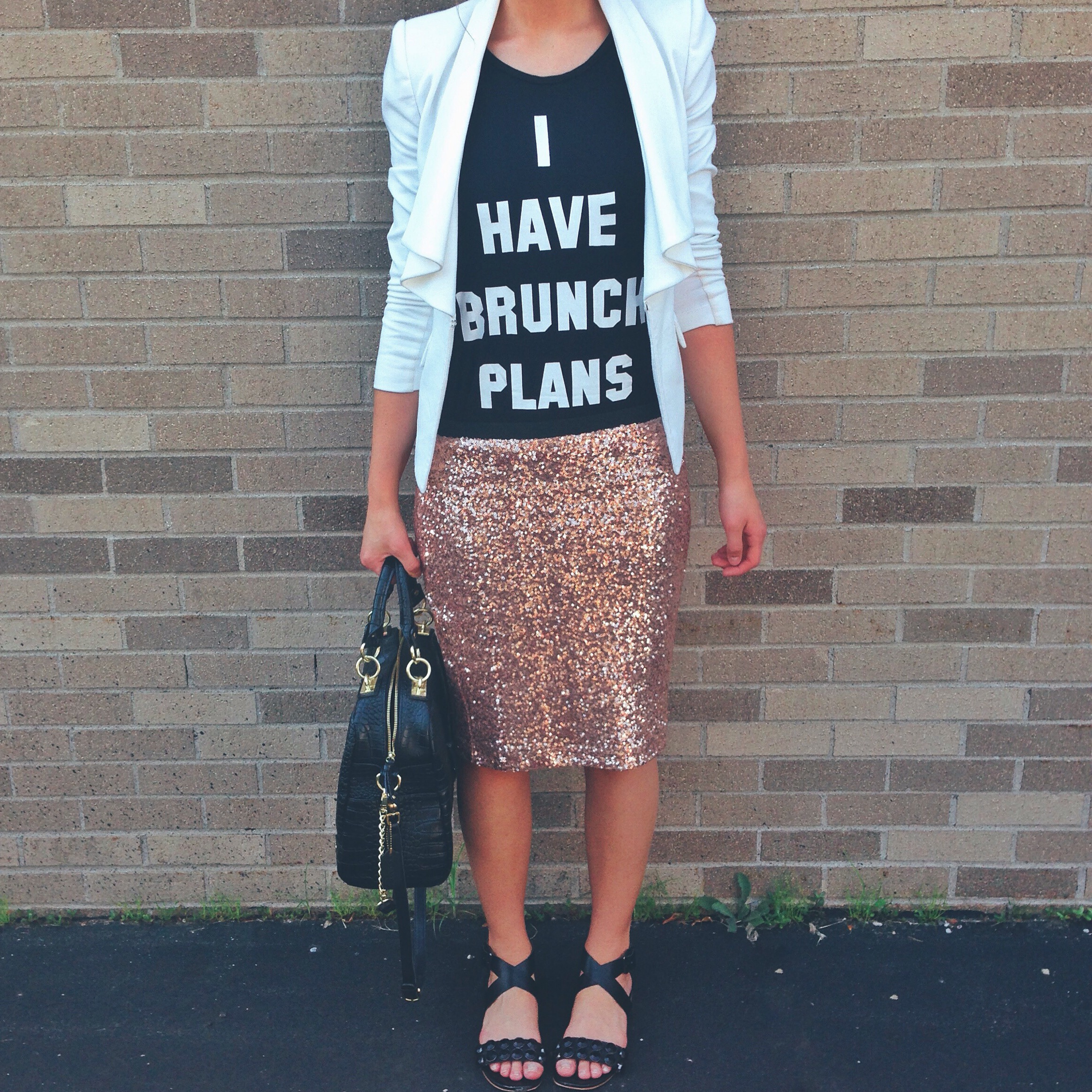 Whenever I do a sequin skirt I like to downplay it with more neutral accessories. I paired my sequin skirt with black strappy sandals and my go-to black bag. Then I finished off the look with my white blazer, that I pretty much wear every other day of my life.