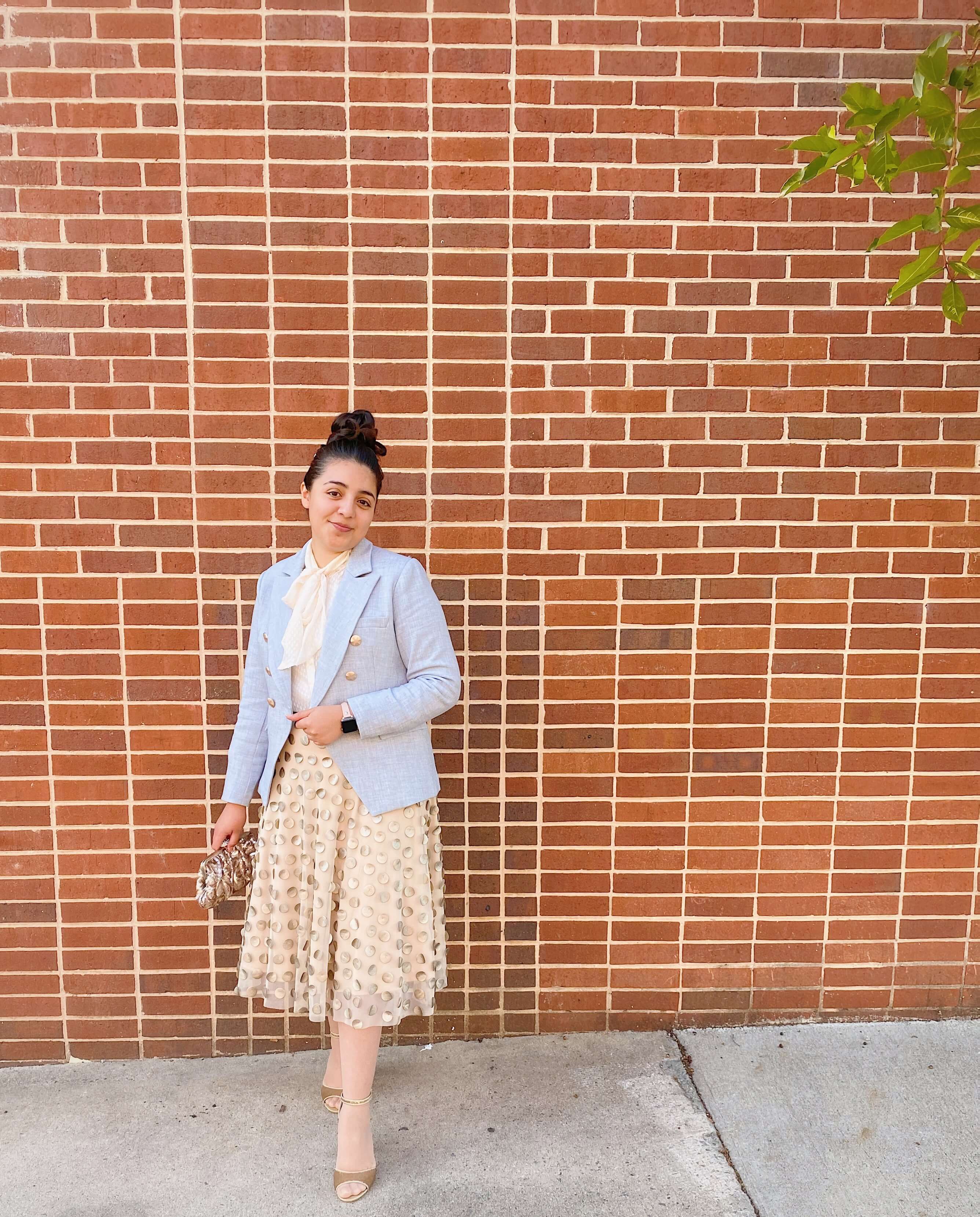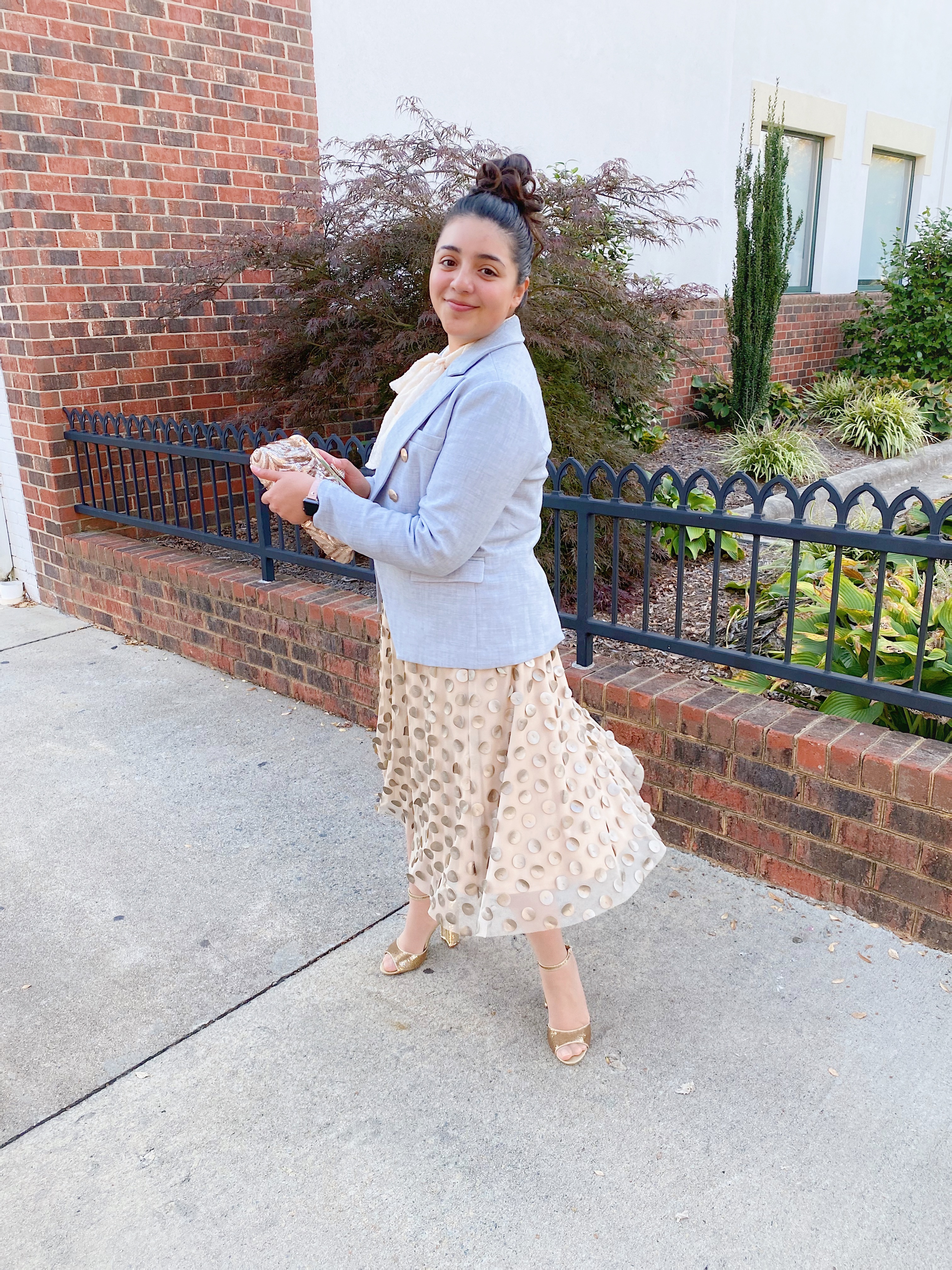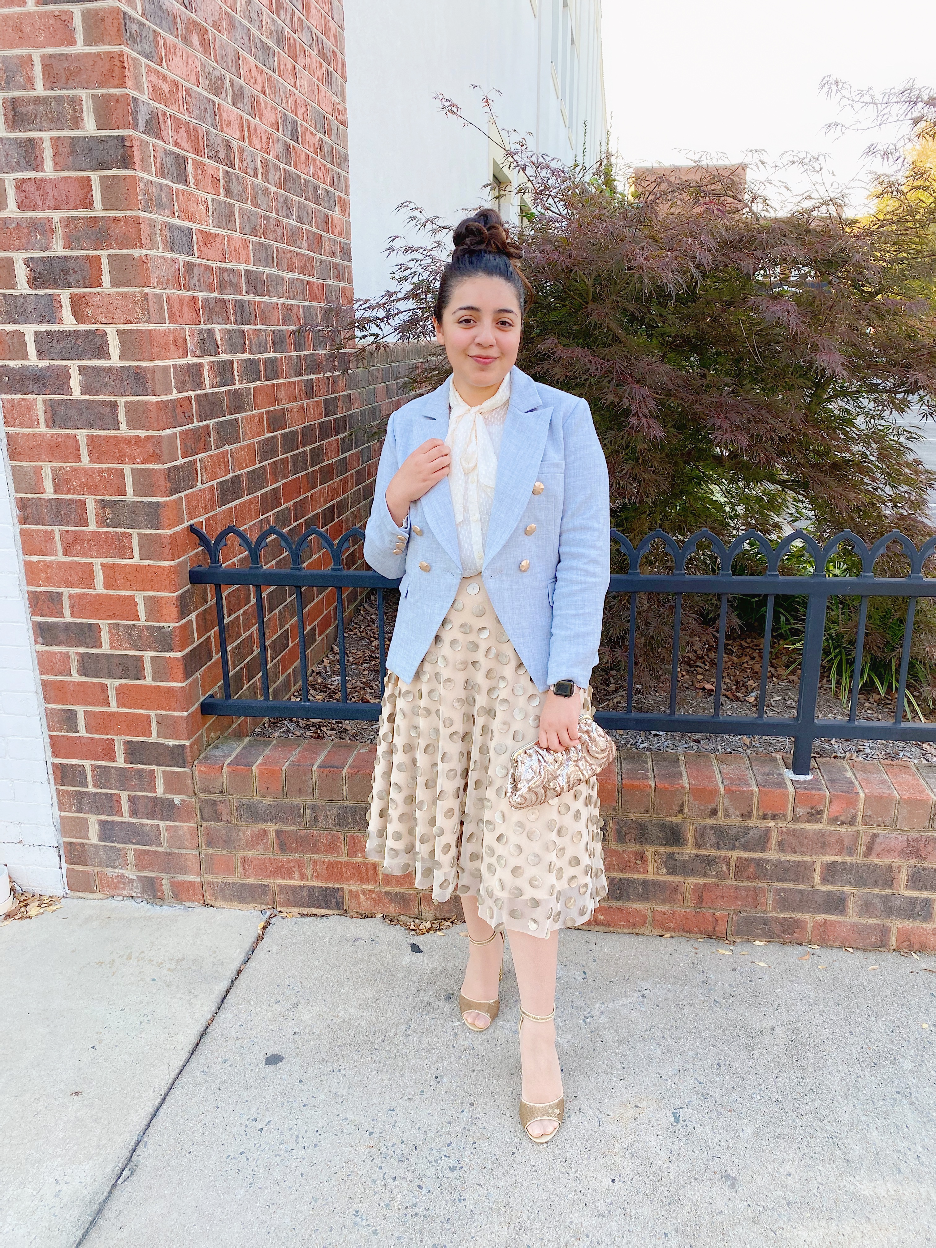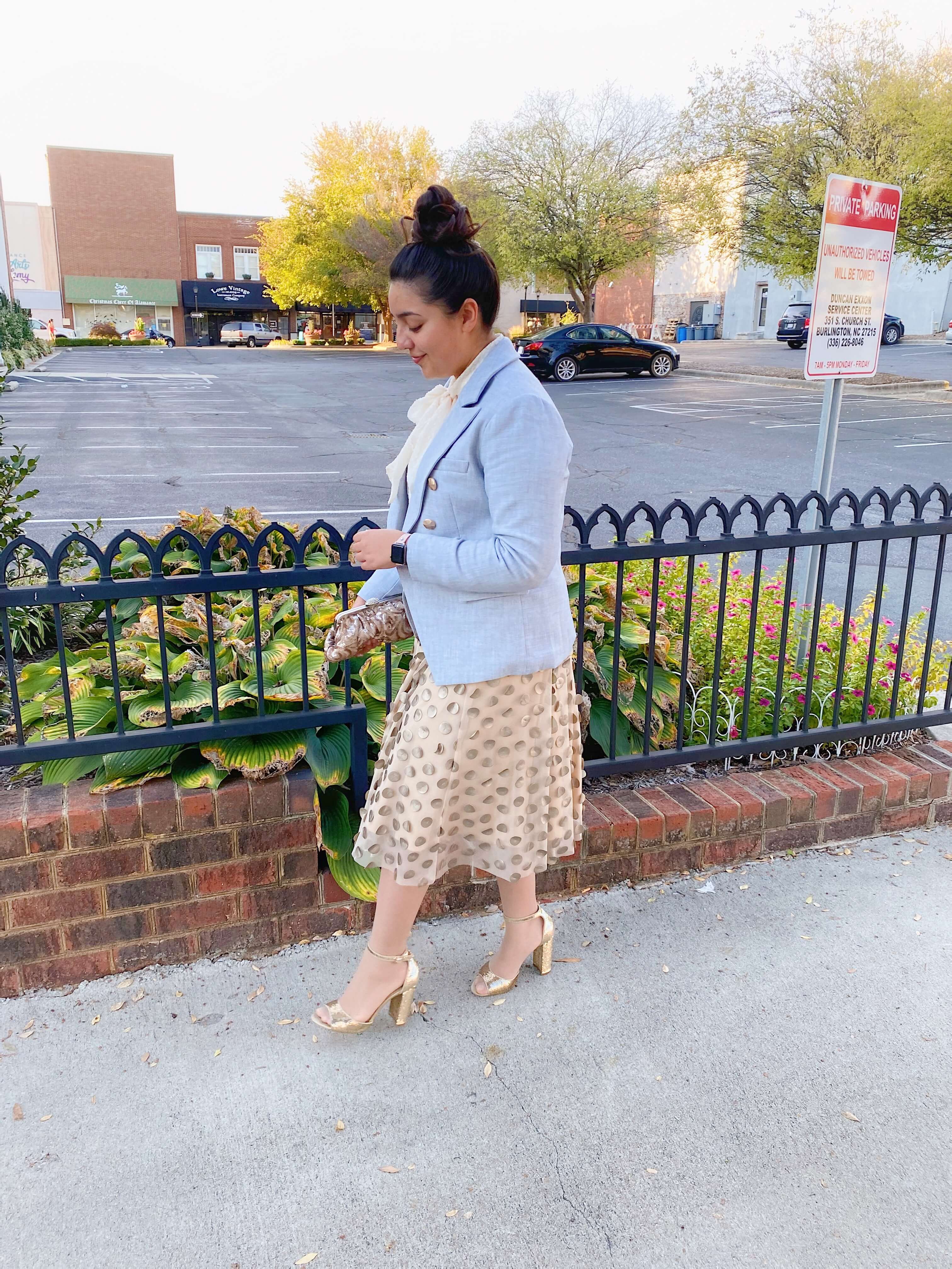 To create an elegant look, I opted for a statement textured skirt and a tucked in bow blouse with sparkly gold heels, keeping to a creamy gold color scheme to pop against the French blue. I accessorized with a pair of pearl hair clips and a gold sparkly clutch for a shimmery, feminine look.