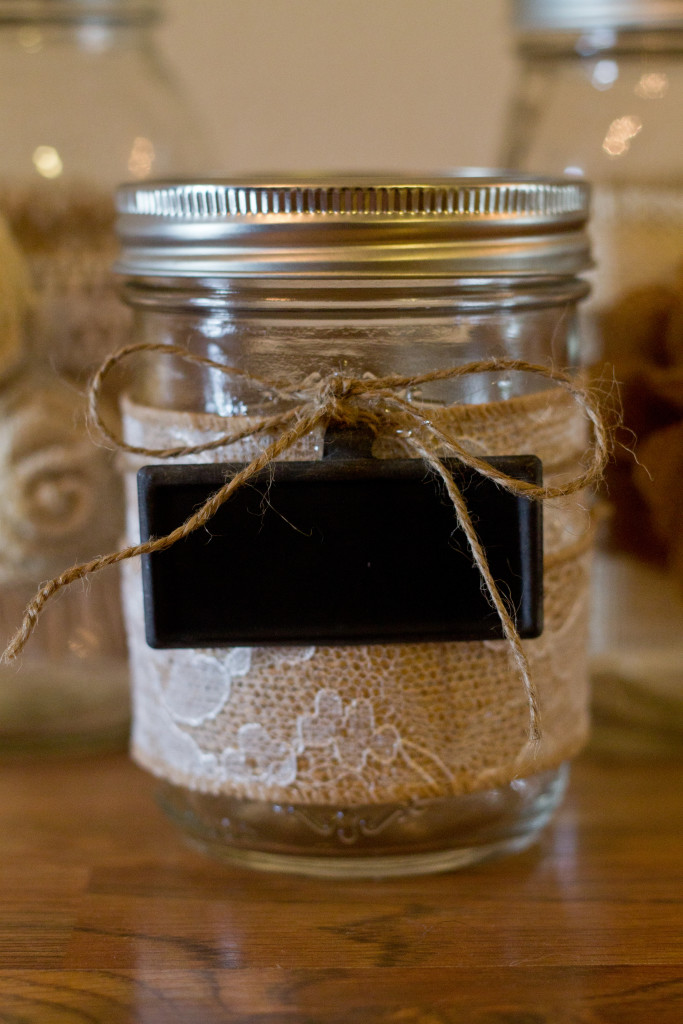 Next, find accents you like — they don’t all have to be burlap. Your accents can be wooden buttons, painted letters or metal flowers. Choosing something that contrasts against the burlap can make your jars stand out and fit in with your personal décor.