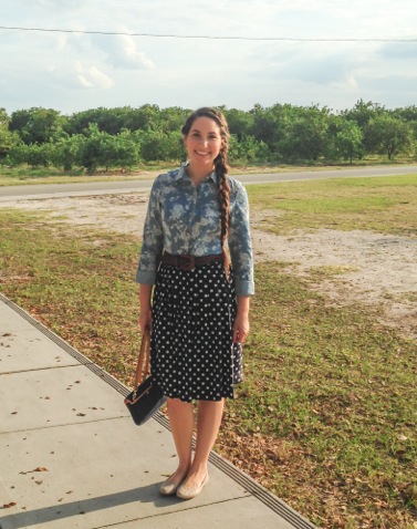 If you aren’t able to find any jean skirts, try a jean shirt to get an instant casual polished look. This is one of my favorite ways to be casual. The navy polka dot skirt above is another $1.50 Salvation Army find.