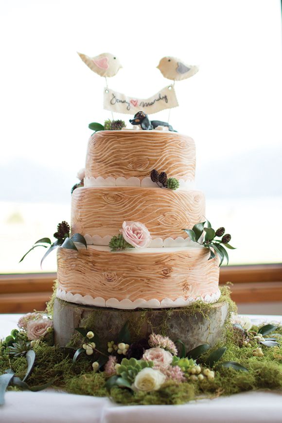 This oh-so-lovely cake makes me smile! It is so cute! Once again, the moss is a must. I love the moss and flowers that hug around the wood stump. Even the cake’s icing is made to appear like wood bark. This rustic, earthy decor all complement the cake well and is topped with, of course, love-birds!