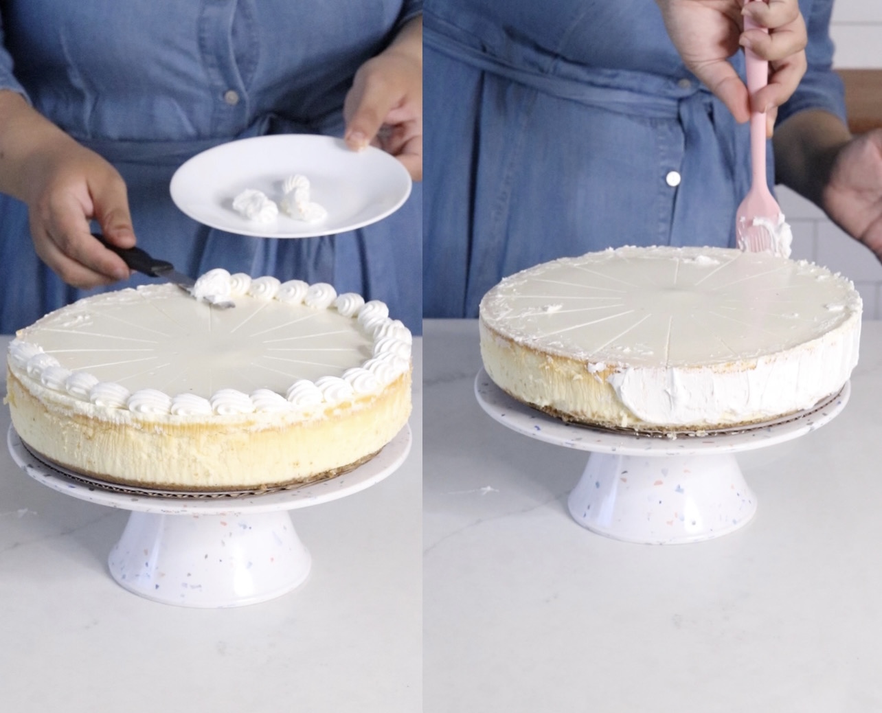 With the paring knife, gently remove the whipped cream around the cheesecake, and using the spatula, spread it around the sides.