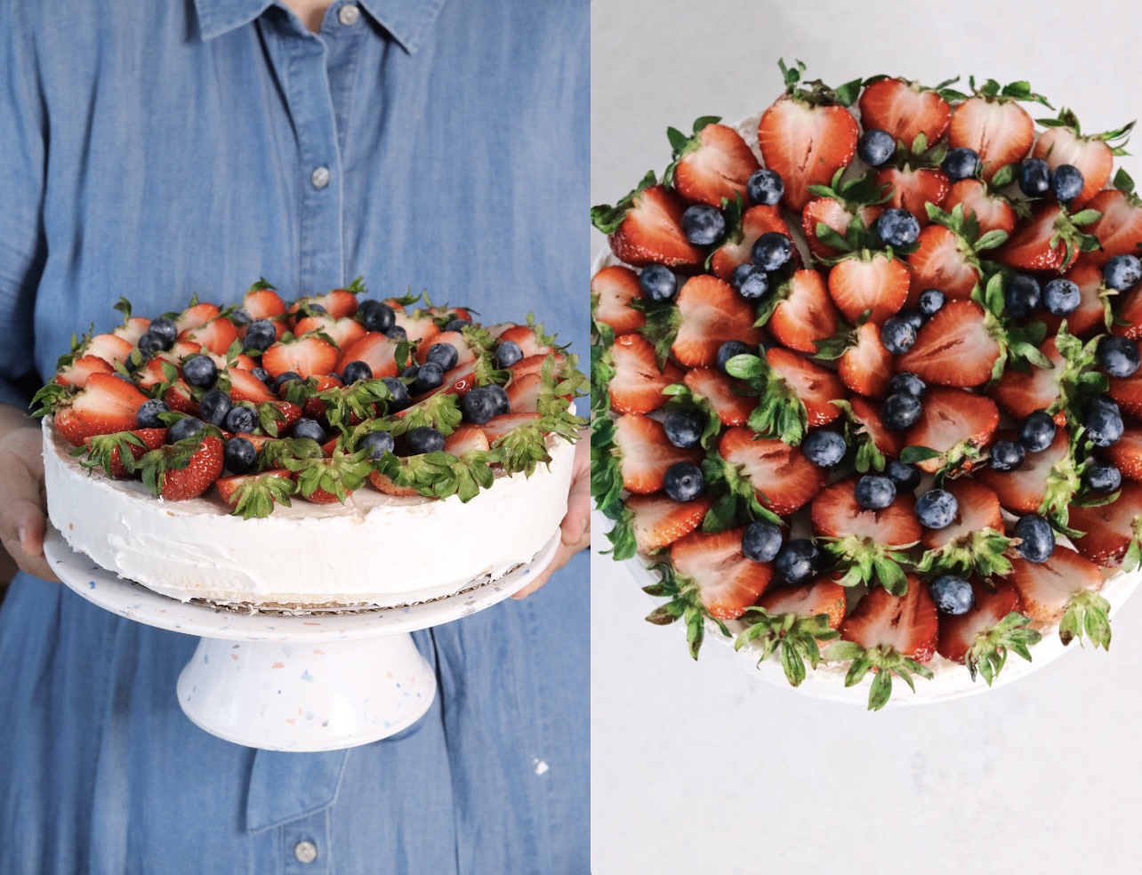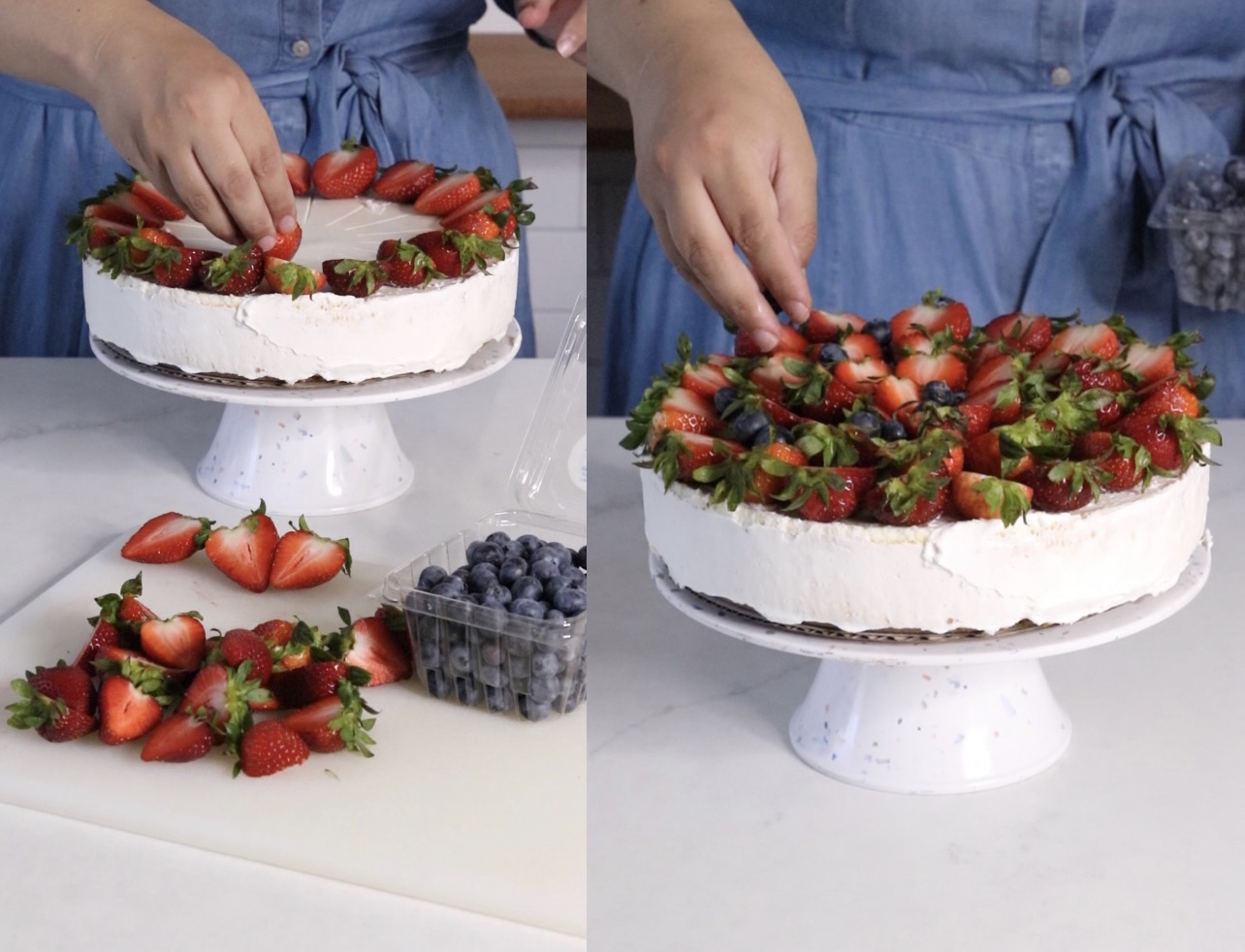 After washing all berries, slice the strawberries in half lengthwise and place them on top facing up. Once the cake is all covered add the blueberries.