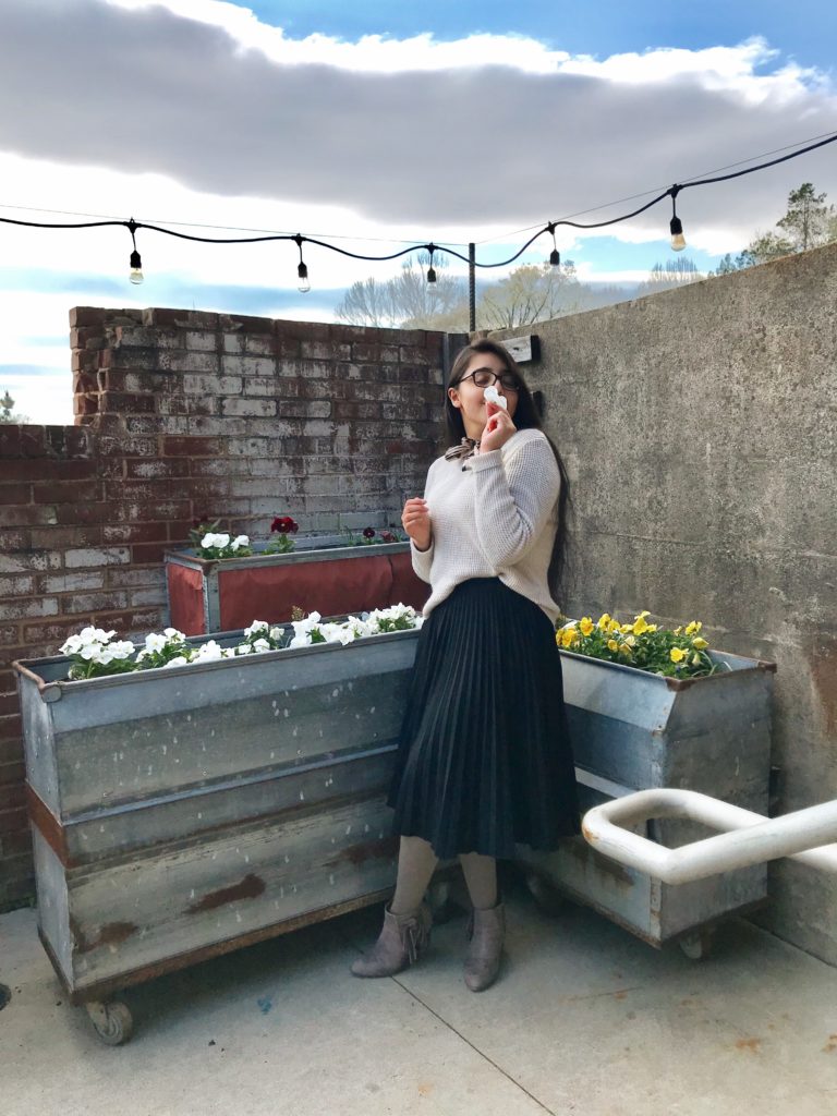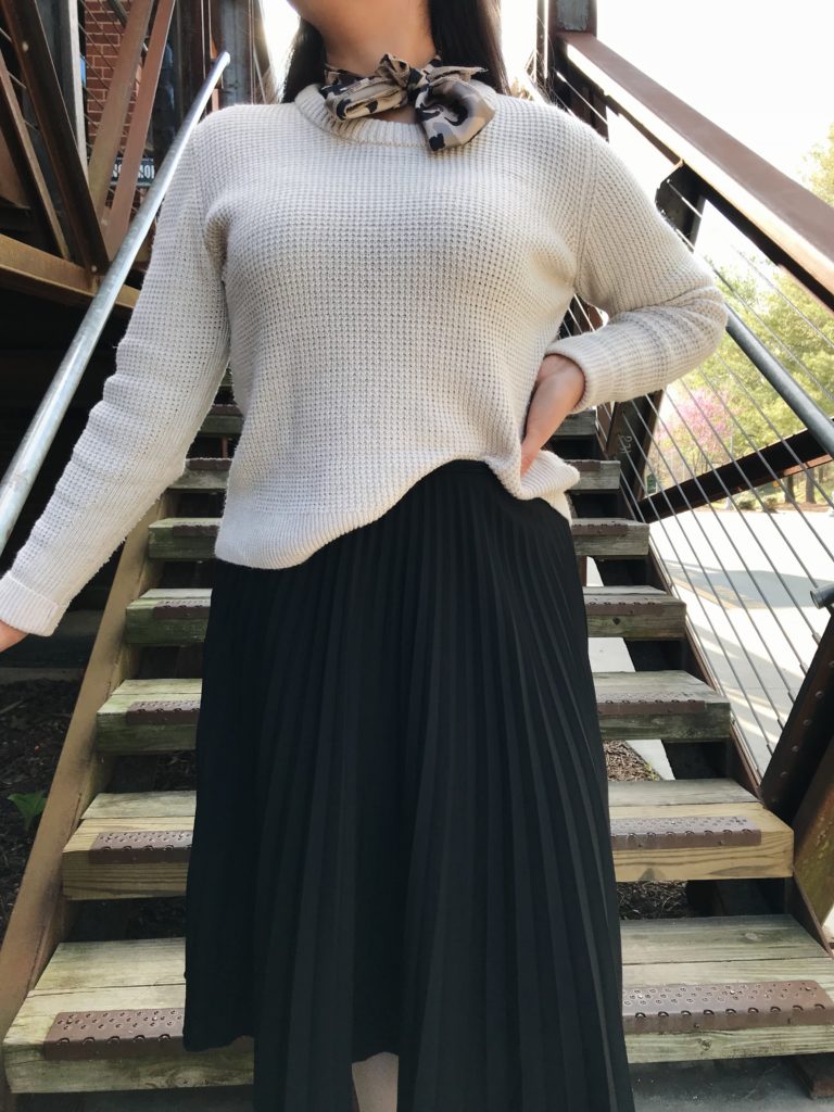 The basic black pleated midi skirt has been a staple in my closet for quite some time. You can find them almost anywhere in various colors, lengths, and textures, and they are so versatile! I love tucking in a more casual knitted sweater for a casual feel. And let’s be honest here, nothing feels cozier than a nice lightweight sweater. I kept my tights a basic gray to match my booties and limit the mix of colors. For this look, I loved that my glasses gave the scarf print some continuity. It’s the little things, y’all!